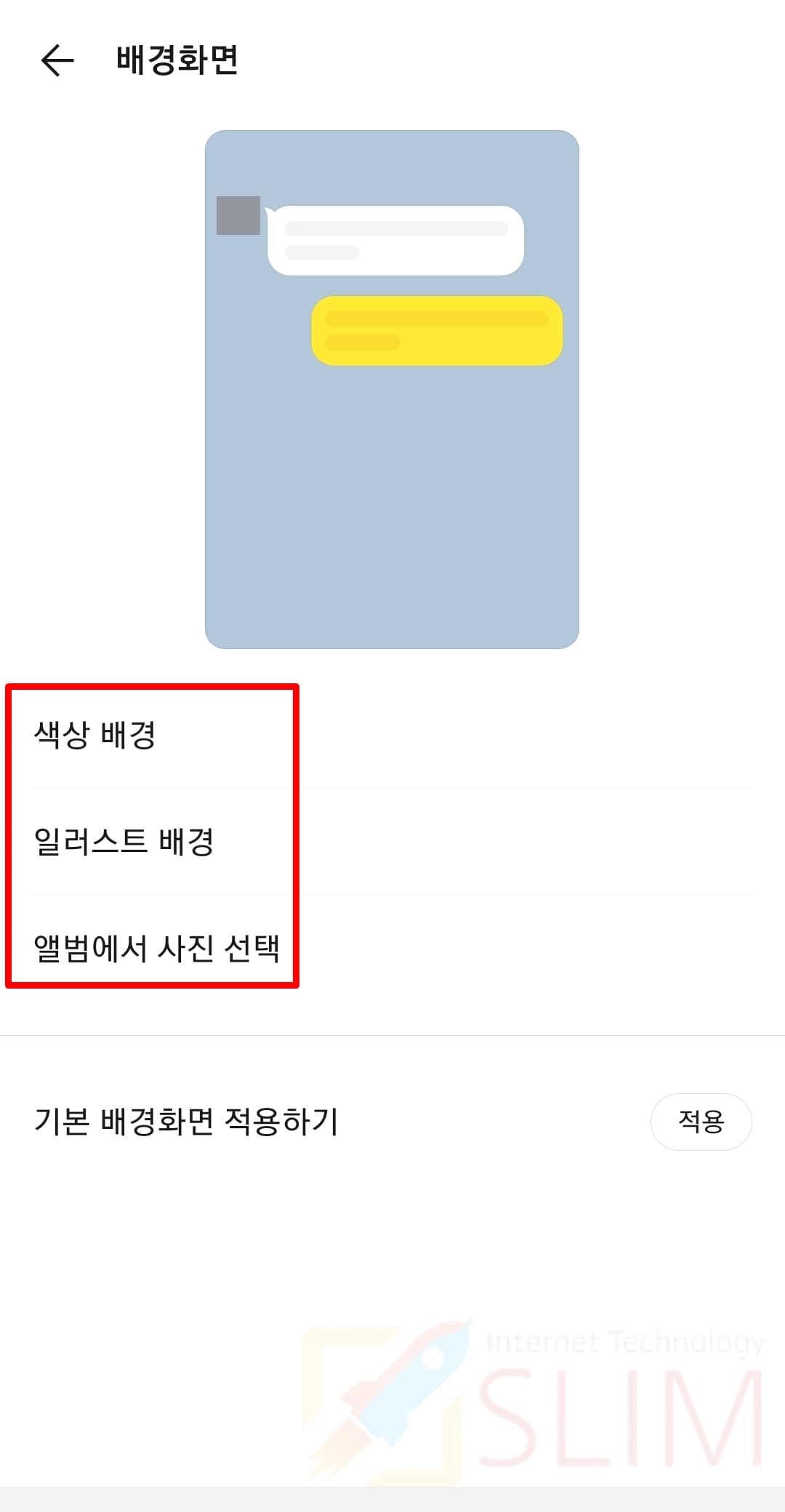 첫번째로 소개드리는 것은 전체 채팅방 배경화면을 바꾸는 방법입니다. 그래서 설정시 현재 참여하고 계신 모든 채팅방의 배경화면이 같은 디자인으로 일괄 변경되는데요. 즉 기본 배경을 바꿔주는 것으로 두번째 방법으로 소개드리는 채팅방별 배경화면을 만들기 전 먼저 설정해주시는 것을 추천드립니다.
