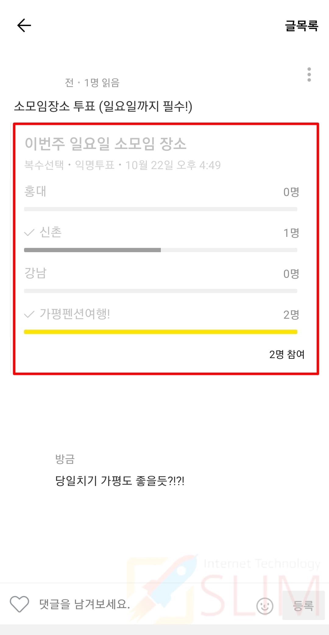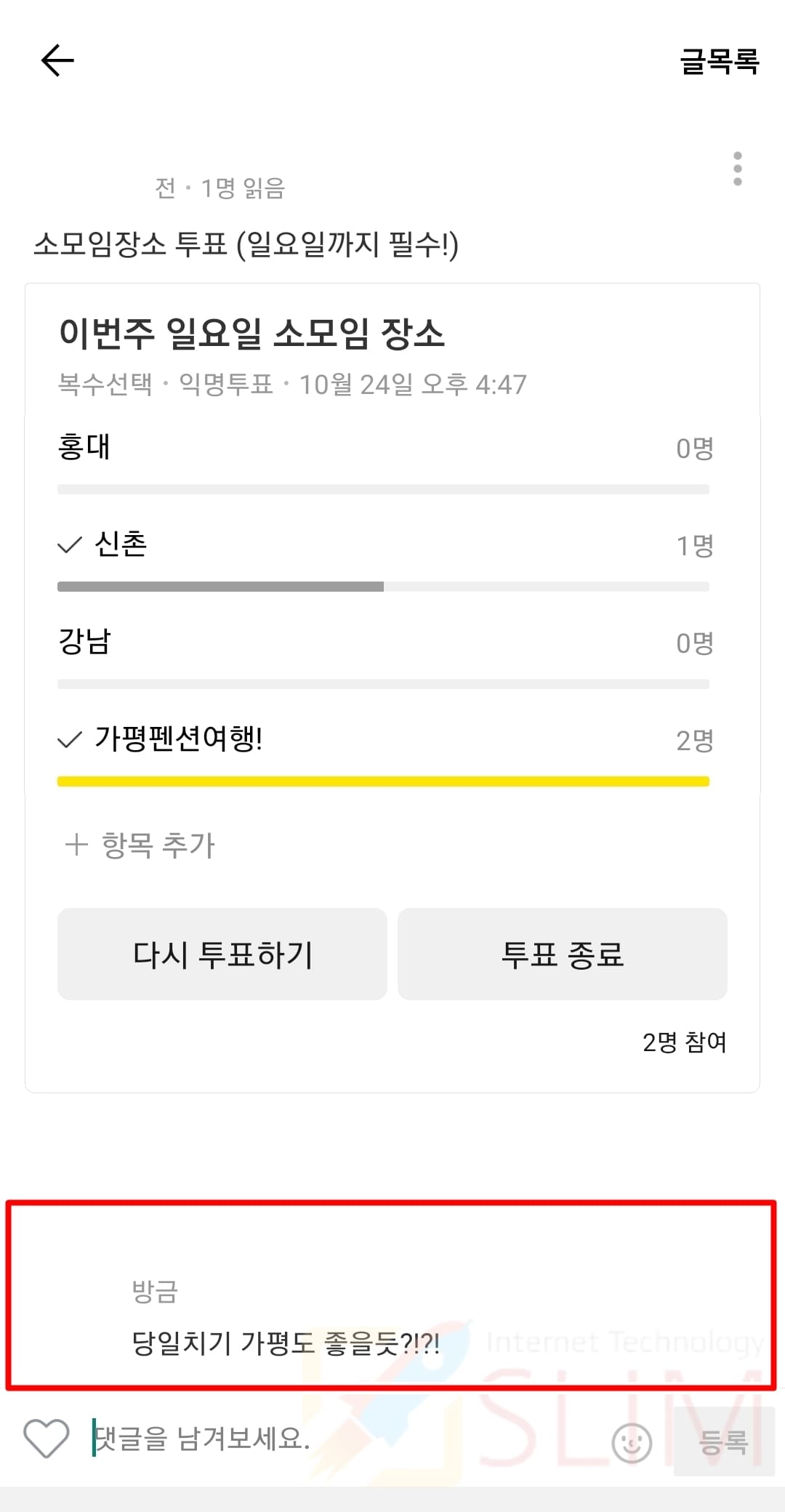 카카오톡 투표 화면에서는 댓글 기능이 있는데요. 댓글을 통해서 투표에 관련된 의견을 달거나, 내가 원하는 투표 항목에 대해서 어필을 할 수 있습니다.