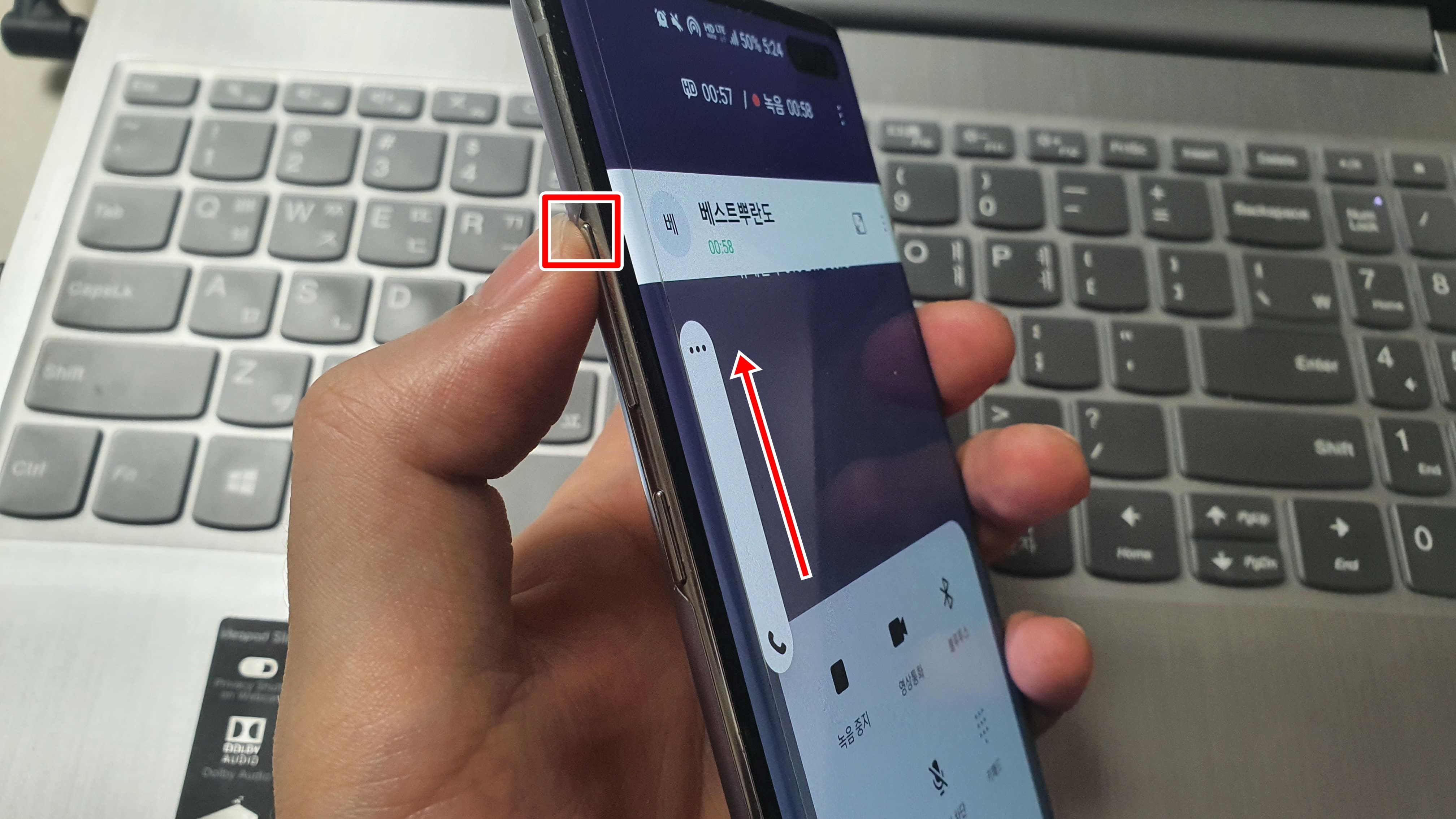 이제 상대방과 통화중이라면 갤럭시 통화음량 조절이 가능해지는데요. 조절의 방법은 갤럭시 배젤에 있는 볼륨버튼(+,-)를 눌러서 조절하는 것입니다. 사진상의 저의 갤럭시S10을 기준으로 설명드리자면 좌측 배젤에 소리조절 버튼이 달려 있는데요. 위를 누르면 소리가 커지고, 아래를 누르면 소리가 작아지게 됩니다. 이제 높이기/줄이기를 나눠서 설명드리도록 하겠습니다.