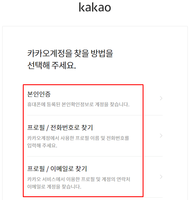 7. 여기까지 진행하면 카카오 계정 찾기로 아이디, 비밀번호를 모두 확인해서 이용이 가능합니다.
