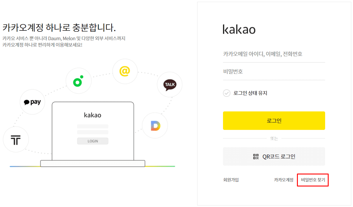 스마트폰에서 카카오톡 어플리케이션을 다운로드 받고 한번만 로그인하면 계속해서 사용할 수 있기 때문에 본인의 카카오톡 로그인 계정의 아이디와 비밀번호를 까먹게 되는 경우가 많습니다. 이렇게 본인의 계정을 까먹으면 나중에 스마트폰을 변경할 때 카카오톡 로그인이 어려울 수 있고, PC카카오톡이나 메일 서비스등의 이용도 어려울 수 있습니다.