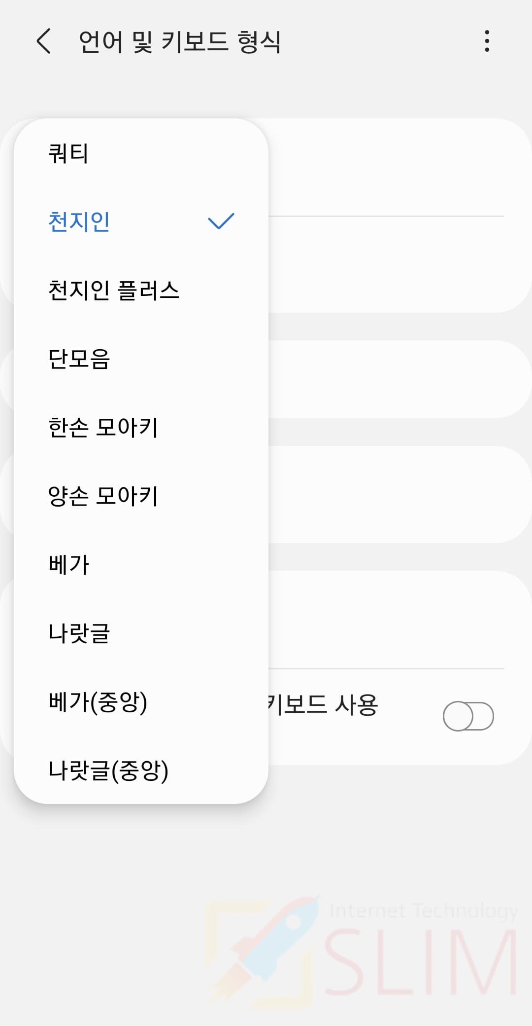 먼저 위의 갤럭시 키보드 변경 방법에 따라서 한국어를 클릭했을 때의 모습입니다. 갤럭시 한글 키보드에서 제공되고 있는 종류는 10가지로 (쿼티, 천지인, 천지인 플러스, 단모음, 한손 모아키, 양손 모아키, 베가, 나랏글, 베가(중앙), 나랏글(중앙)이 있습니다. 순서별로 각 키보드별 모양이 어떻게 생겼는지 아래에서 확인해보시고 사용하고 싶으신 키보드를 선택해서 적용해보시길 바랍니다.
