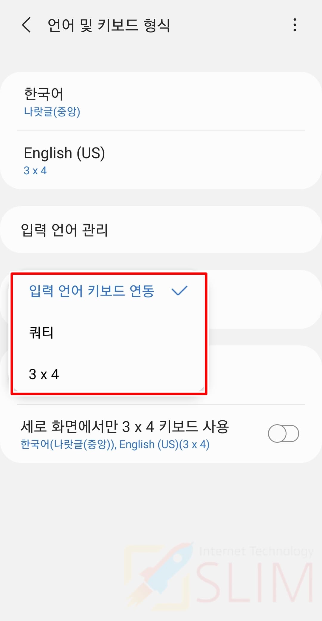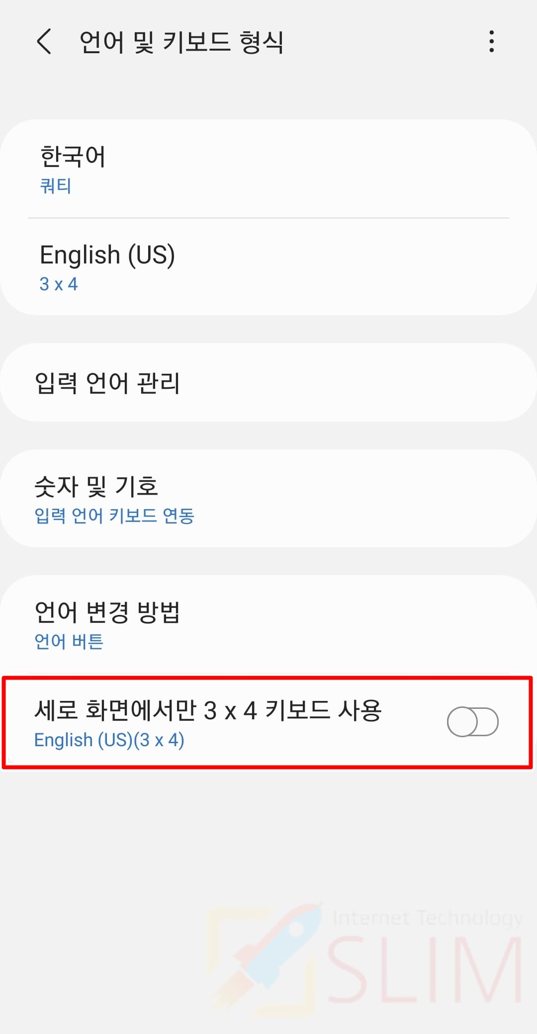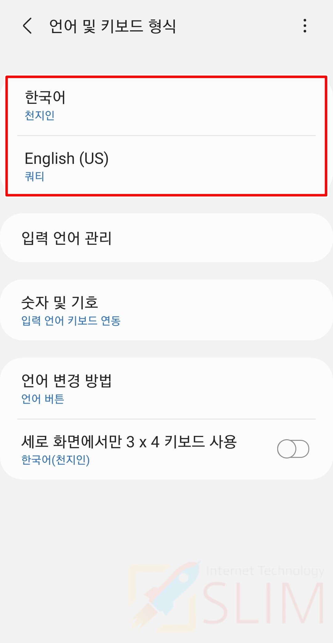 이것은 갤럭시 영문 키보드 변경으로 English 3x4를 사용하고 계신 분들에게만 적용되는 기능입니다. 스마트폰을 가로로 이용할 때 3x4로 영문을 사용하기는 불편하다는 사실을 알고 계실 것입니다. 그래서 3x4로 영문 키보드를 사용하고 계시다면 반드시 위 세로 화면에서만 3x4 키보드 사용을 활성화해주시길 바랍니다. 그러면 세로모드에서는 3x4로 보여지고 가로모드에서는 쿼티로 사용하실 수 있습니다.