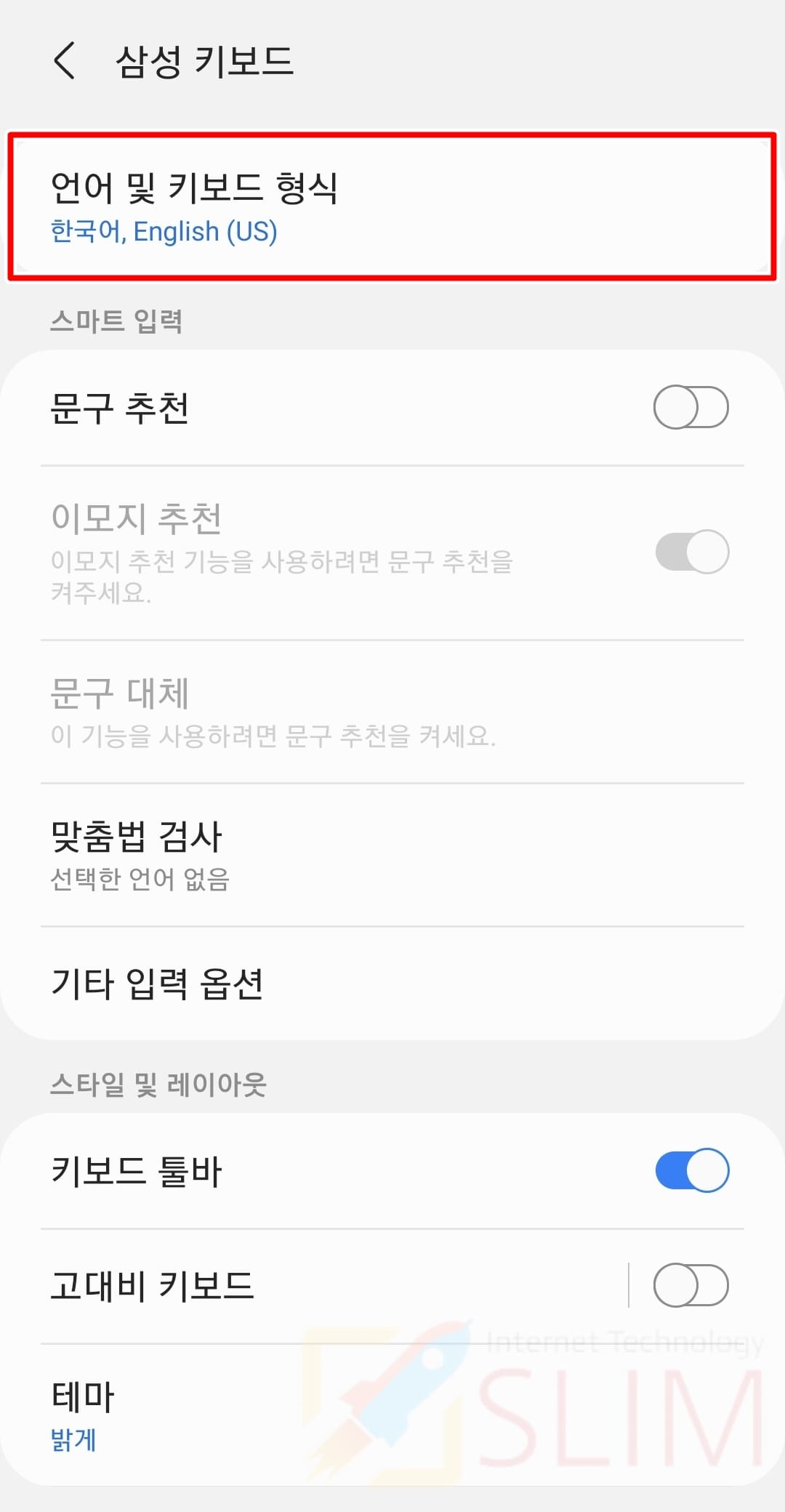 ▲ 위 사진과 같이 설정 앱에서 복잡하게 들어가지 않고도 삼성키보드 설정 페이지로 바로 이동할 수 있습니다. 갤럭시 키보드 변경은 위 페이지에서 '언어 및 키보드 형식'을 눌러주기만 하시면 된답니다. 더 쉽고 편리하게 사용하세요.