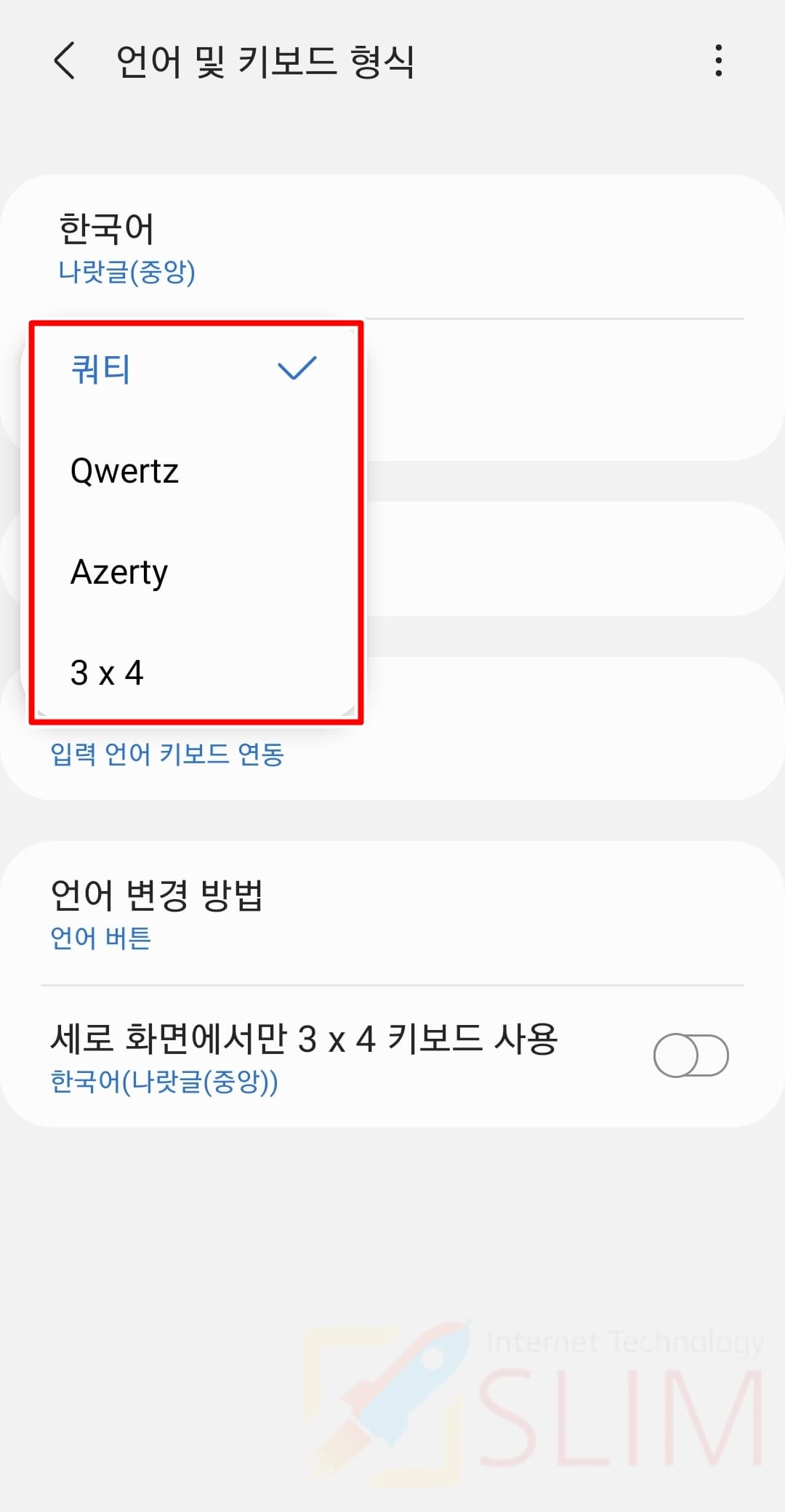 입력 언어 키보드 연동은 현재 이용중인 자판의 모양을 그대로 사용한다는 것입니다. 그리고 다른 두가지 모양은 쿼티와 3X4가 있는데 설정시 보여지는 모습은 아래와 같습니다.