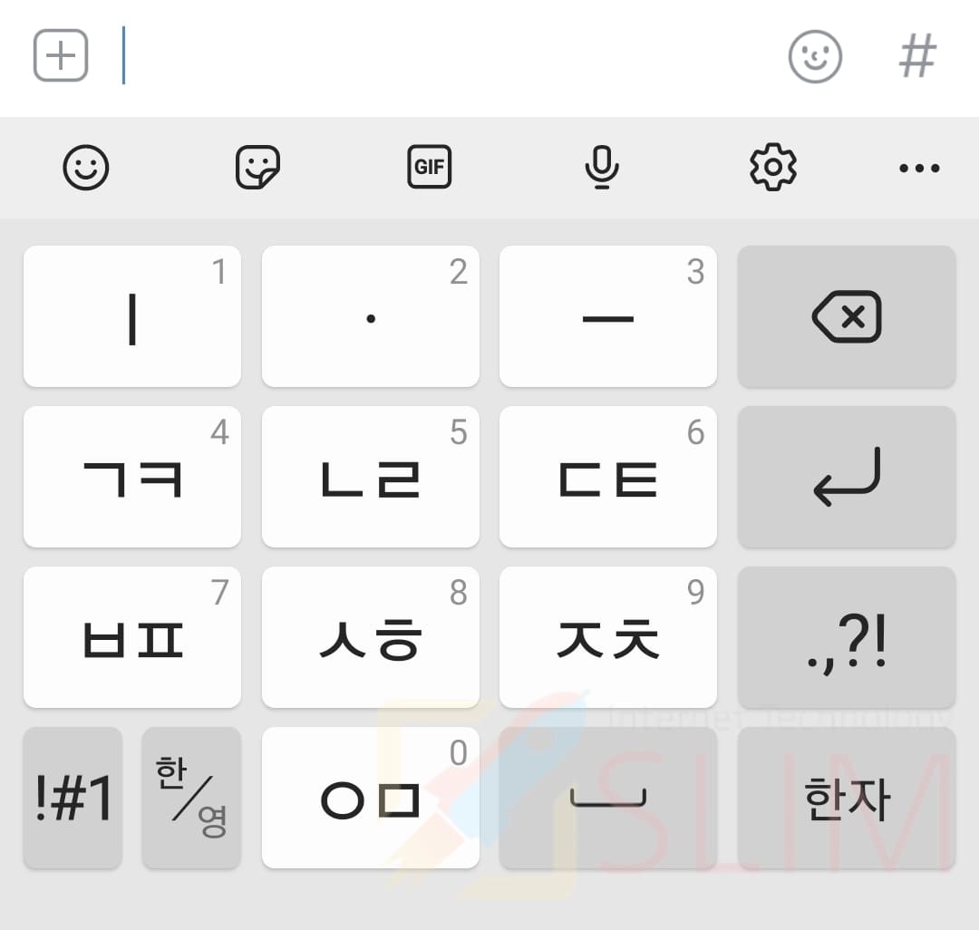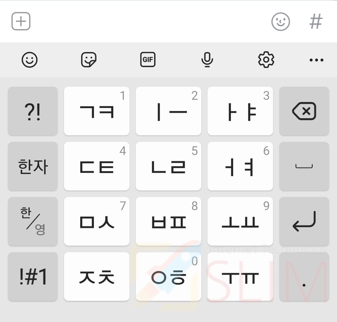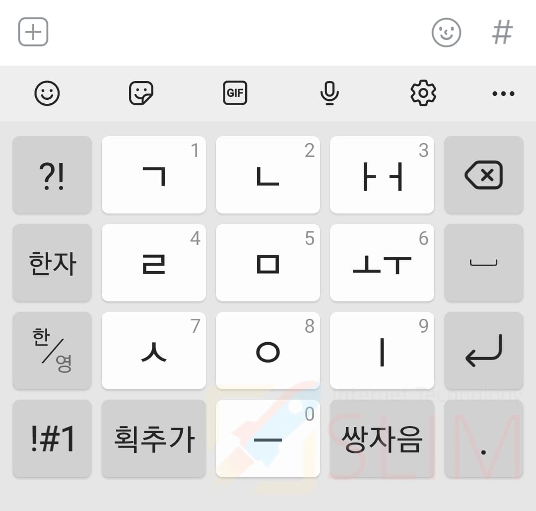 두번째는 갤럭시의 기본 키보드인 천지인 키보드입니다. 아이폰이 아닌 삼성에서 오랫동안 사용된 자판의 디자인으로 과거 피쳐폰에서도 이용되었던 자판 구성이기 때문에 익숙함을 느끼시는 분들이 많습니다. 두번 눌러 자음을 자꾸고 위 상단의 ㅣ,.,-로 모음을 쉽게 만들 수 있기 때문에 오타율도 적은 것이 장점입니다.