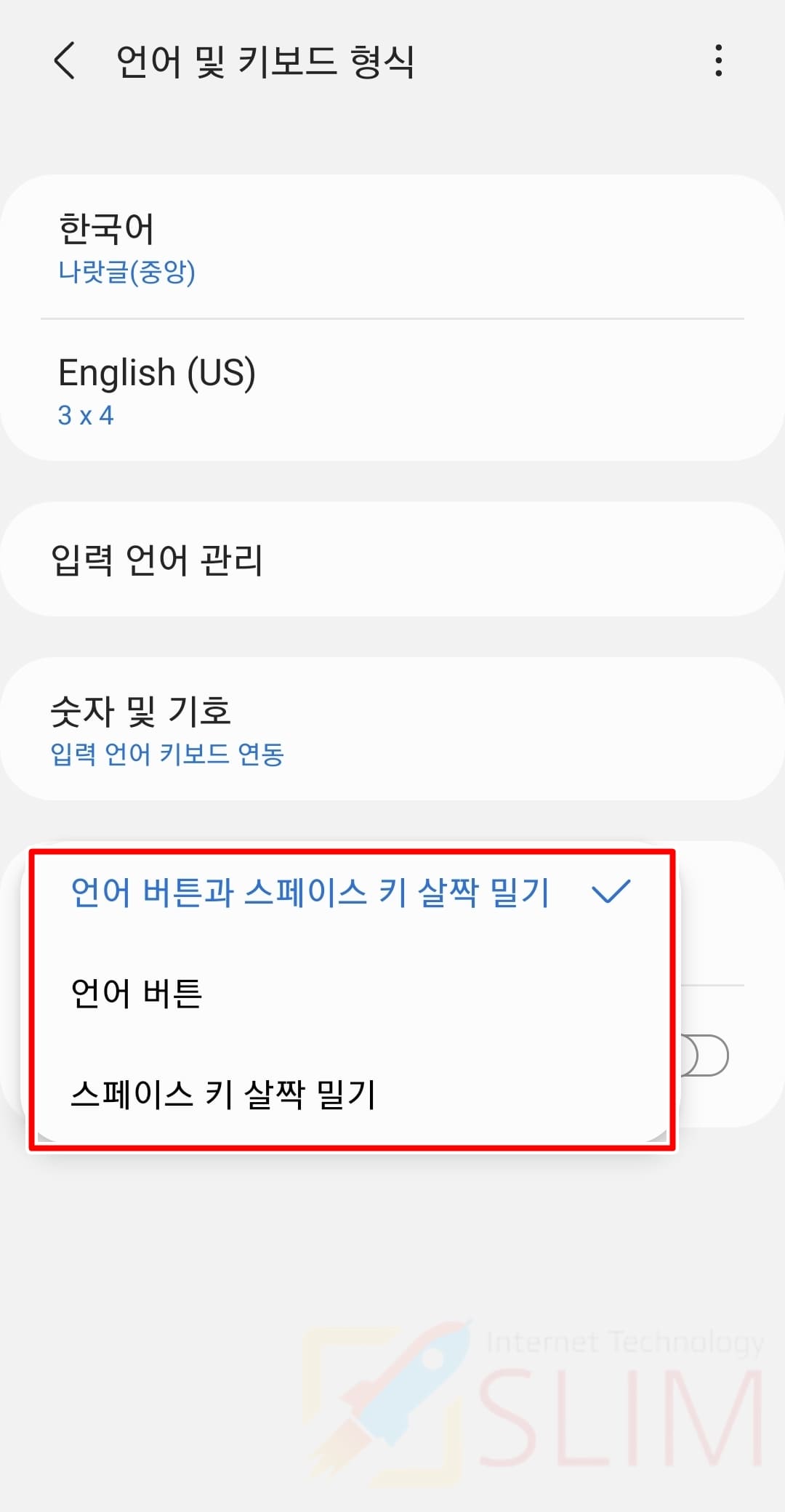 기본으로 설정된 것은 언어 버튼 (한/영 키)입니다. 여기서 언어 버튼말고도 스페이스 키 살짝 밀기나 스페이스 키 살짝 밀기를 선택하시면 한영키를 이용하지 않고도 언어를 바꾸실 수 있습니다.