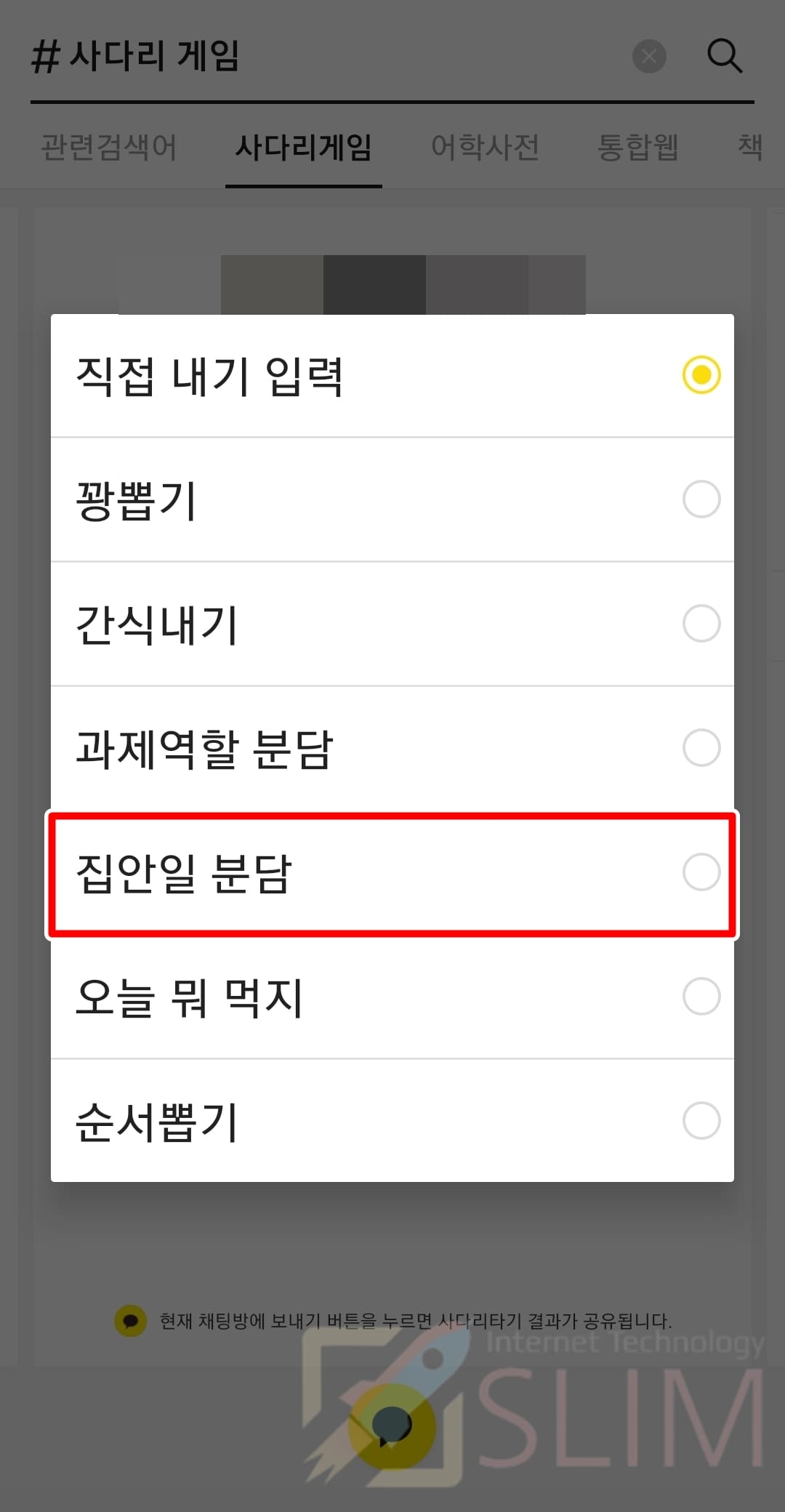 저는 가족과 함께 오늘 집안일 분담에 대해서 내기를 하기로 하여서 집안일 분담을 클릭해주었습니다. 이외에도 꽝뽑기, 간식내기, 과제역할 분담, 오늘 뭐 먹지 등의 다른 선택지도 있으니 참고하시길 바랍니다.