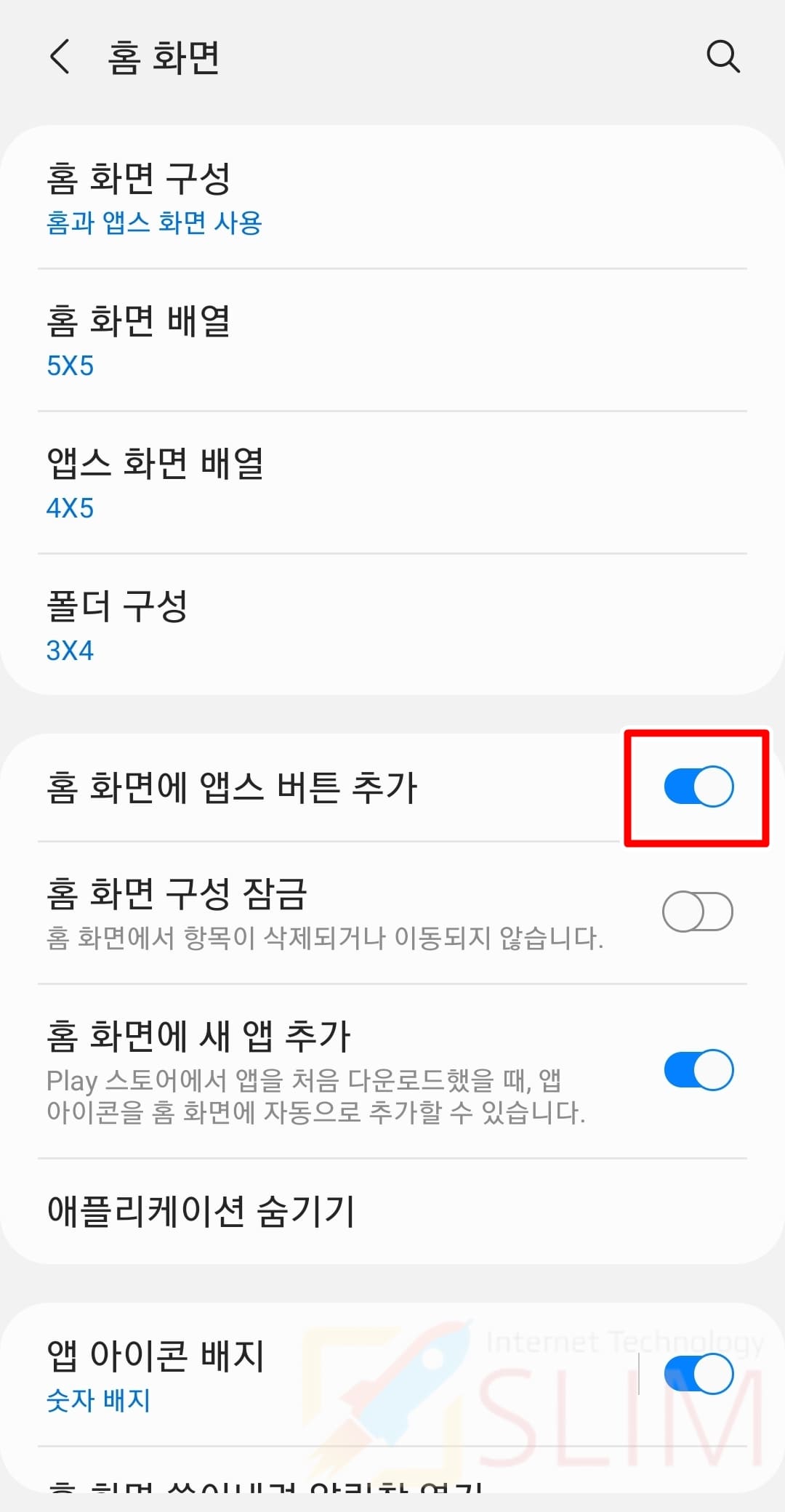3. 홈 화면에 앱스 버튼 추가를 활성화합니다.