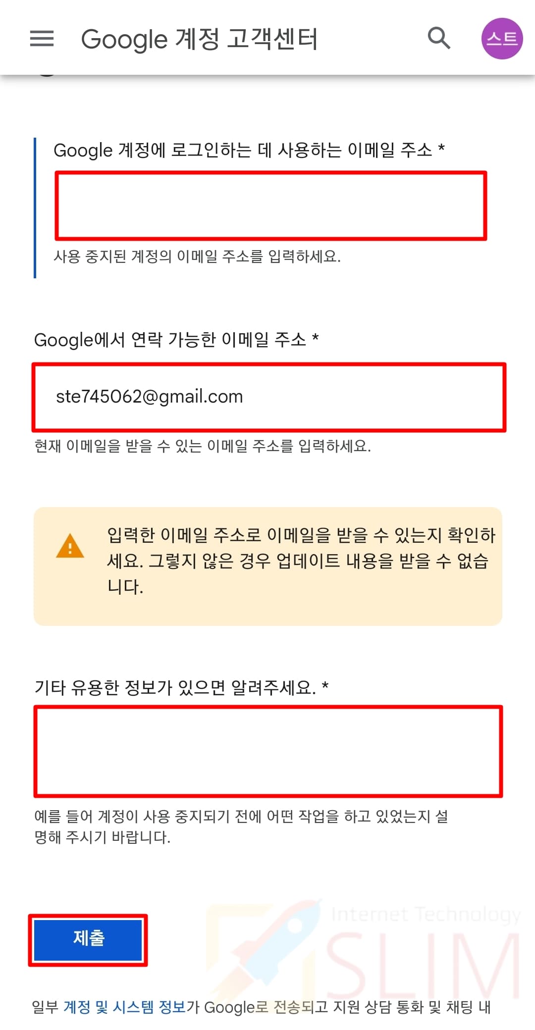 4. 구글에서 연락 가능한 이메일 주소를 입력합니다.