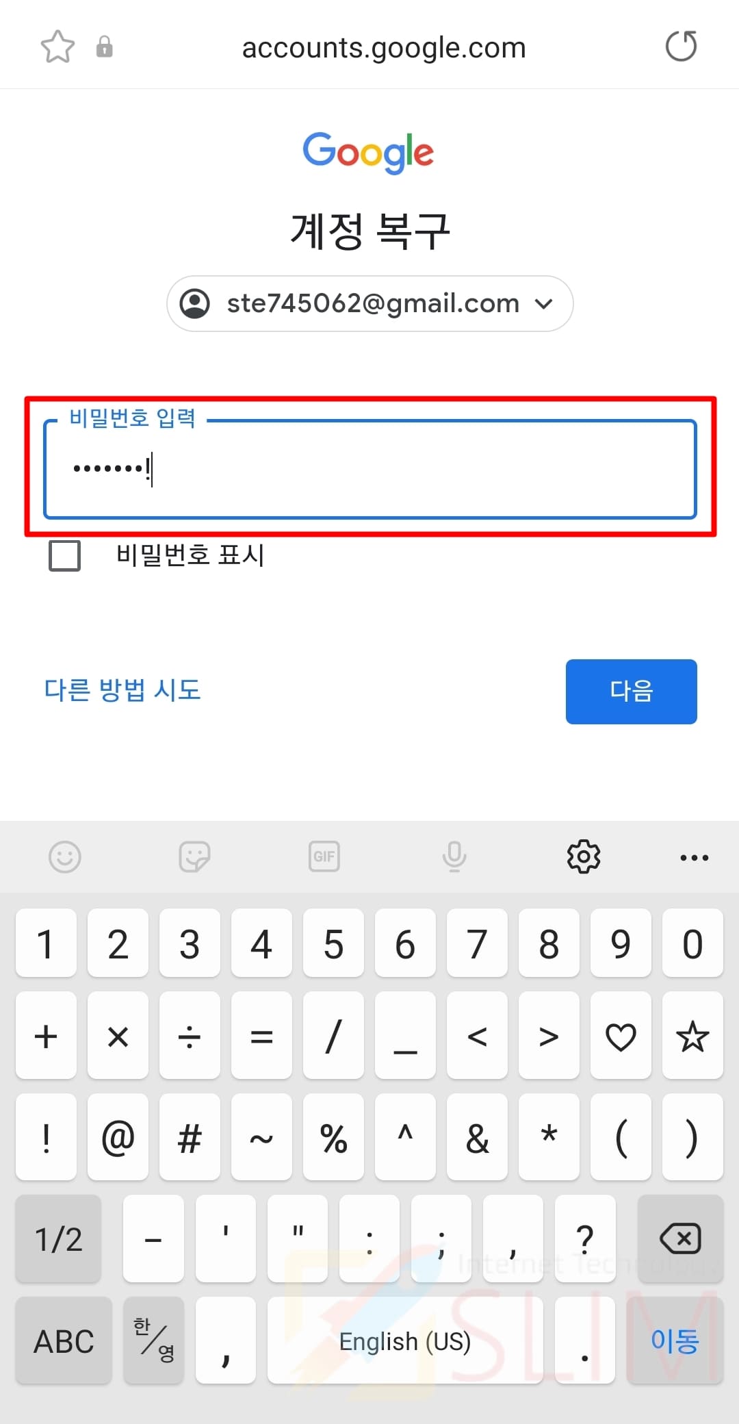비밀번호가 틀리다면 "다른 방법 시도"를 눌러 휴대폰 인증등을 하셔서 로그인을 하시면 됩니다.