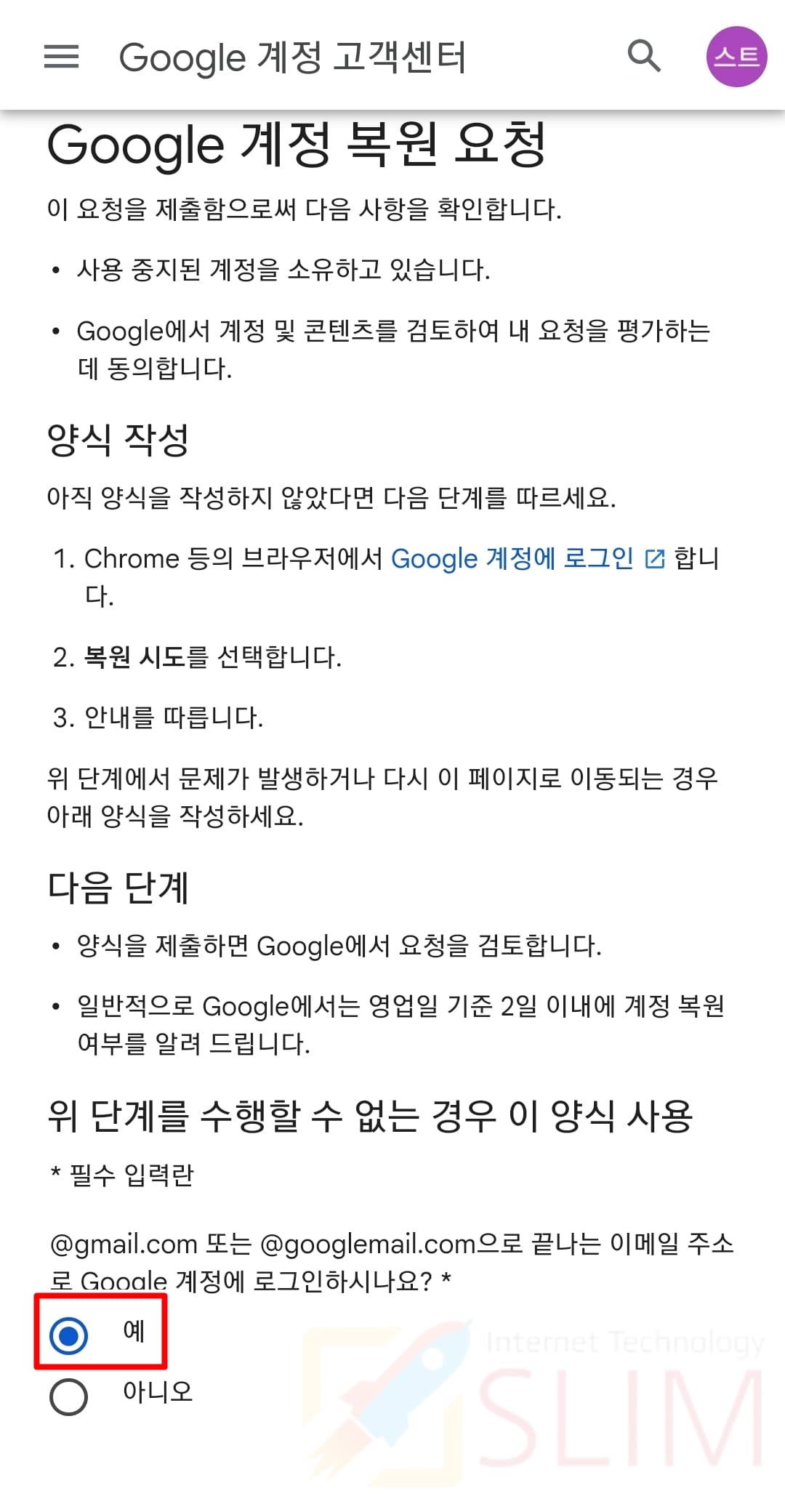 2. @Gmail.com 또는 @googlemail.com 이메일 주소일 경우 예를 선택합니다.