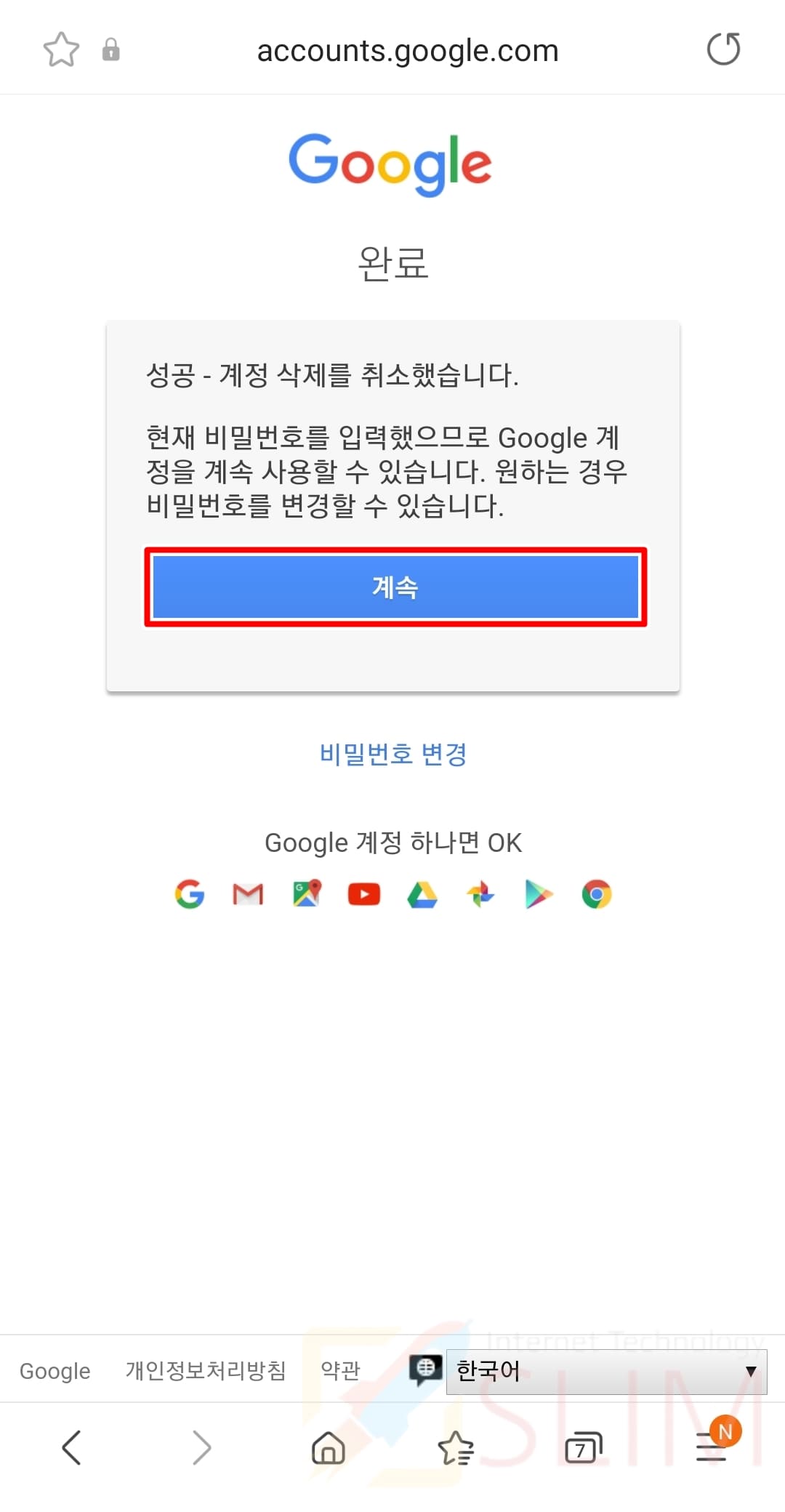 "성공-계정 삭제를 취소했습니다. 현재 비밀번호를 입력했으므로 Google 계정을 계속 사용할 수 있습니다. 원하는 경우 비밀번호를 변경할 수 있습니다." 텍스를 확인할 수 있습니다.