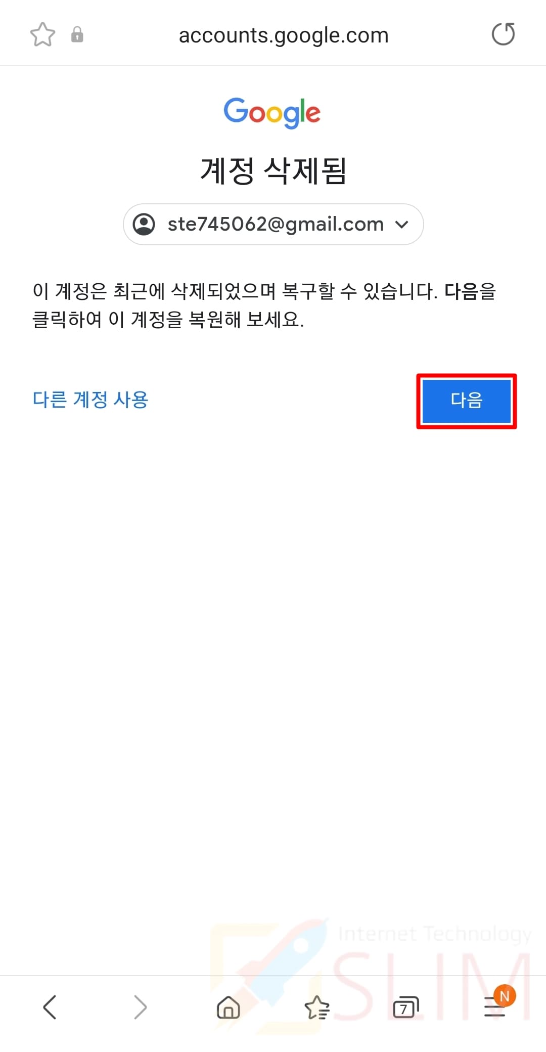 5. 계정 삭제됨 안내 메시지에 다음을 누릅니다.