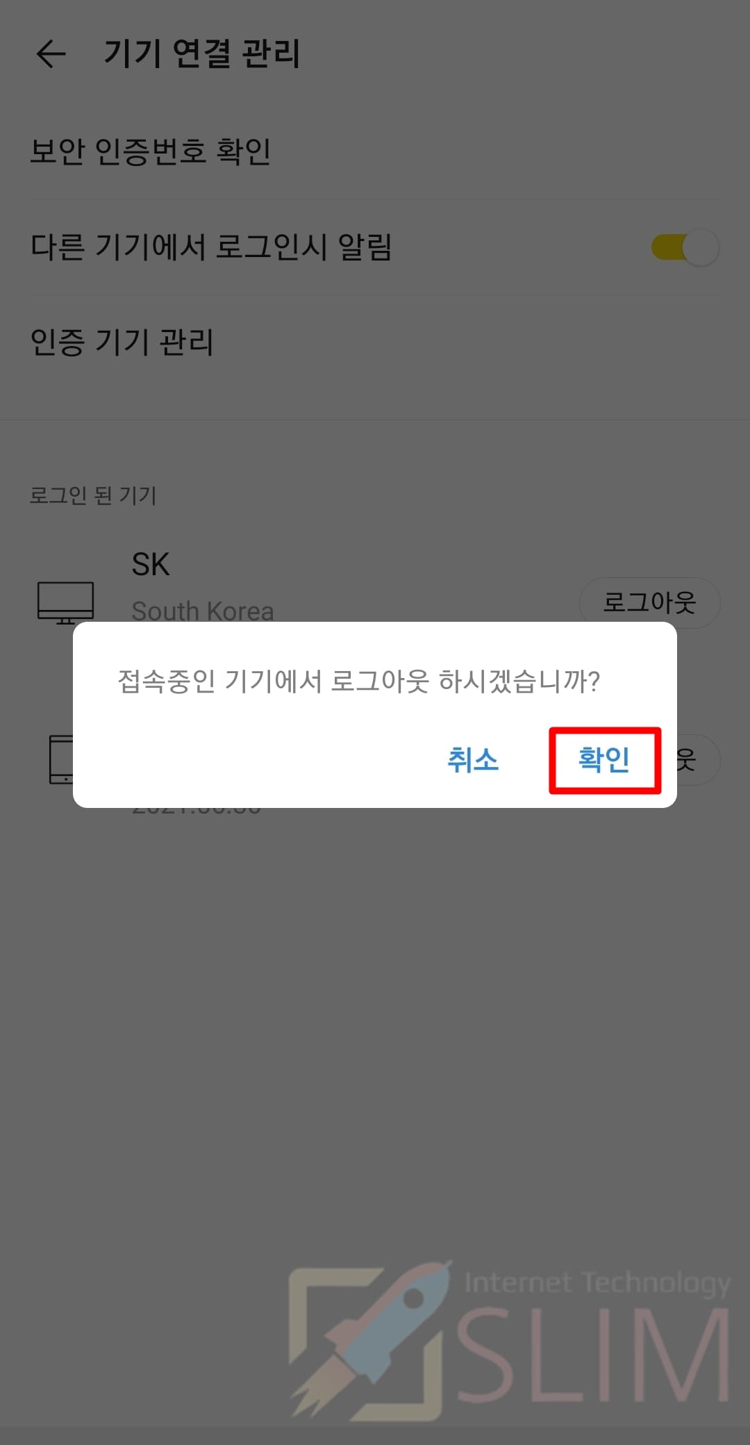 7. 접속중 기기 로그아웃 메시지에서 확인을 누릅니다.