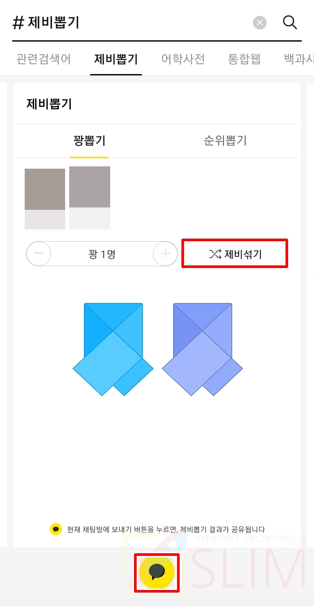 ▲ 제비섞기를 클릭하고 하단의 현재 채팅방에 보내기 버튼을 눌러줍니다. 꽝뽑기와 다르게 순위 뽑기는 참여자인원 전체의 순서만 정해주기 때문에 벌칙자를 따로 설정할 필요가 없습니다. 예를 들어서 채팅방 인원이 5명이면 1등부터 5등까지 무작위로 결정해주는 방식이기 때문입니다.