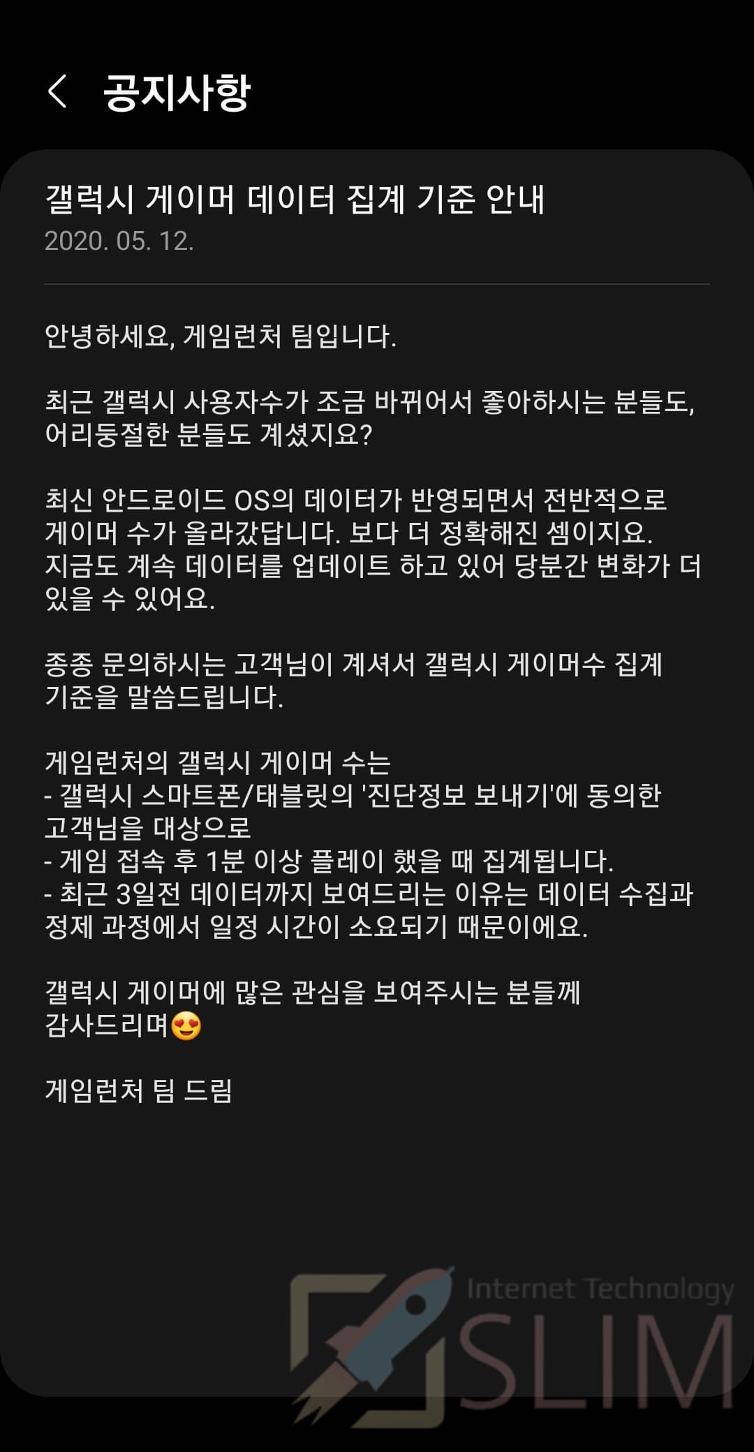 갤럭시 게이머 수는 갤럭시 스마트폰과 태블릿의 '진단정보 보내기'에 동의한 사용자들만 대상으로 게임 접속 후 1분 이상 플레이 했을 때 집계된다고 합니다. 또한 최근 3일전 데이터까지만 보여주는 이유는 데이터 수집과 정제 과정에서 일정 시간이 소요되기 떄문이라고 합니다.