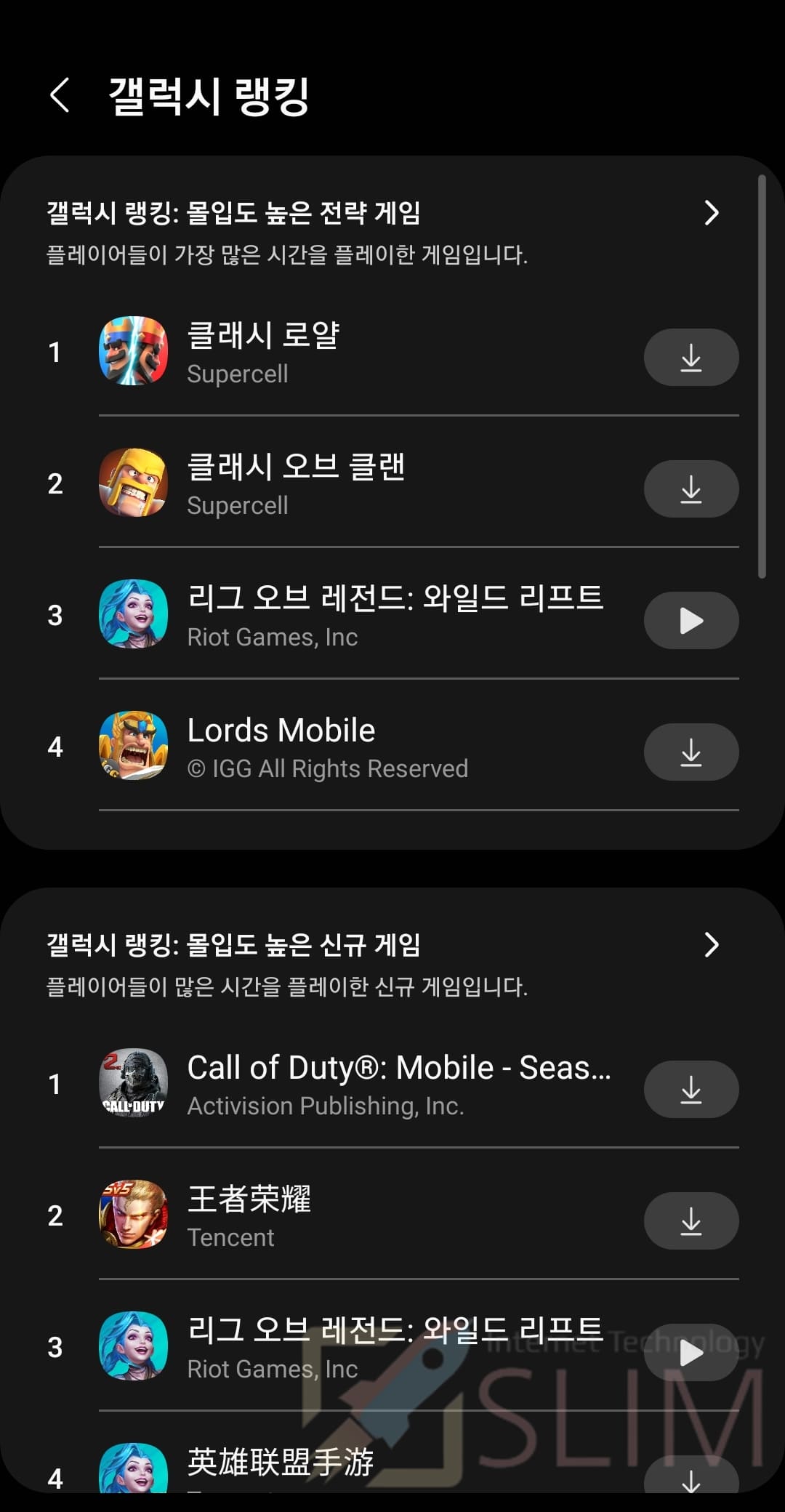 이 순위들을 확인해보면 구글 플레이 스토어에서 추천해주는 게임순위하고는 많이 다른데요. 단순히 다운로드수로 순위를 내주는 것이 아니기 때문에 실제로 유저수가 많거나, 반응이 좋은 순위를 볼 수 있어서 더 정확하다고 할 수 있겠네요. 참고로 현재 대한민국에서 가장 많은 시간 플레이된 게임 순위는 1. 전략적 팀 전투(리그오브레전드) 2. 클래시 로얄 3. 리그 오브 레전드 (와일드 리프트) 4. 클래시 오브 클랜 순입니다.