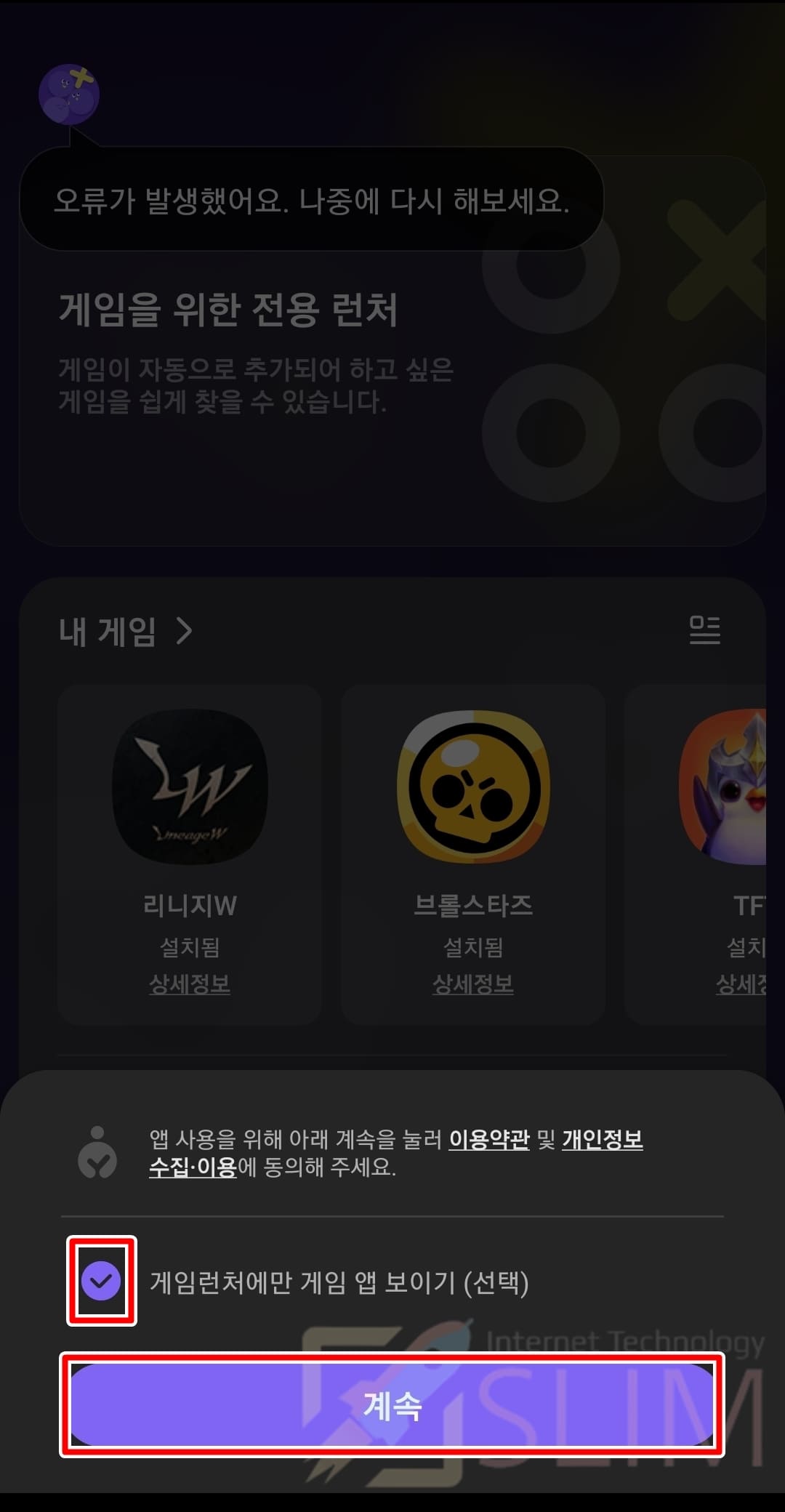 여기서 주의하실 것은 '게임런처에만 게임 앱 보이기 (선택)'이 기본적으로 체크가 되어 있는데요. 여기서 체크상태를 유지한 후 넘어가시게되면 게임 앱들의 아이콘을 스마트폰 앱스화면 목록에서 확인할 수 없게 됩니다. 이 후에 게임 앱을 실행하고 싶으시다면 반드시 게임런처 앱을 실행한 후 원하는 게임을 선택실행을 해야되서 불편할 수 있는데요. 그래서 앱스화면에서 게임 앱이 사라지는 것을 원하지 않으신다면 체크를 해제하는 것을 권장드립니다.