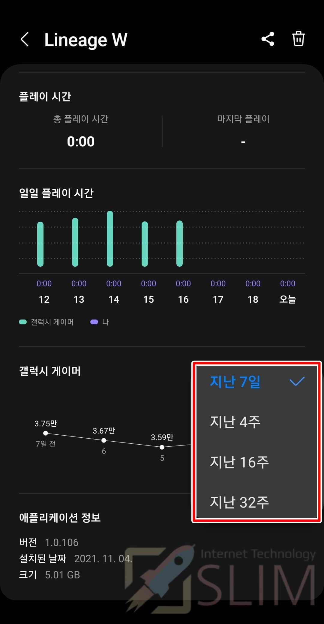 1. 갤럭시 게이머 오른쪽의 지난 7일 선택칸을 클릭합니다.