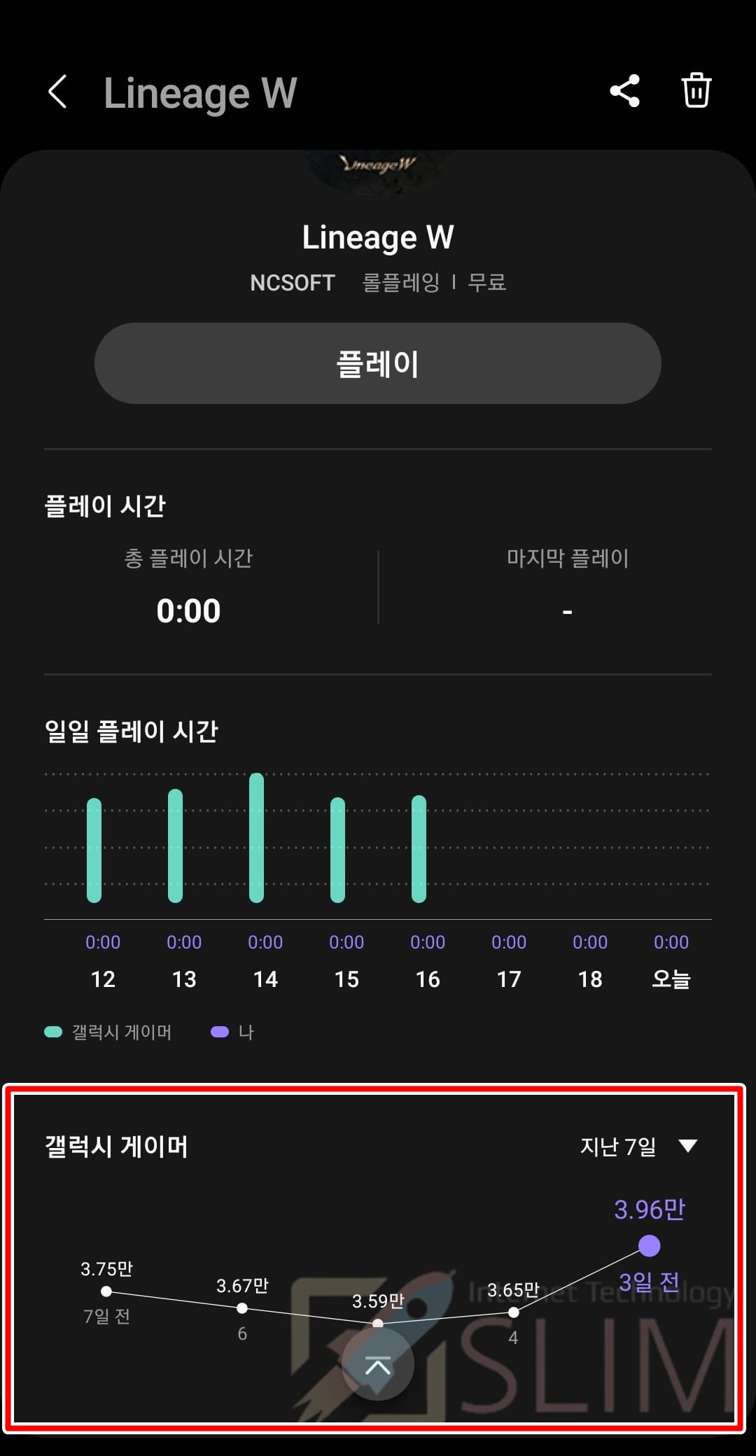 내 게임 아래에 표시되는 게임 앱들은 내가 스마트폰에 설치한 게임 앱들만 보여지게 됩니다. 그래서 갤럭시 게임런처 유저수를 확인하기 위해서는 사전에 게임 앱을 다운로드 받아두셔야 합니다. 저는 리니지w의 유저수 근황이 궁금했기 때문에 사전 설치 후 이용해주었습니다.