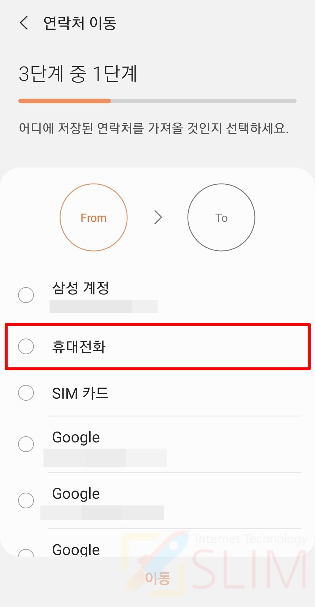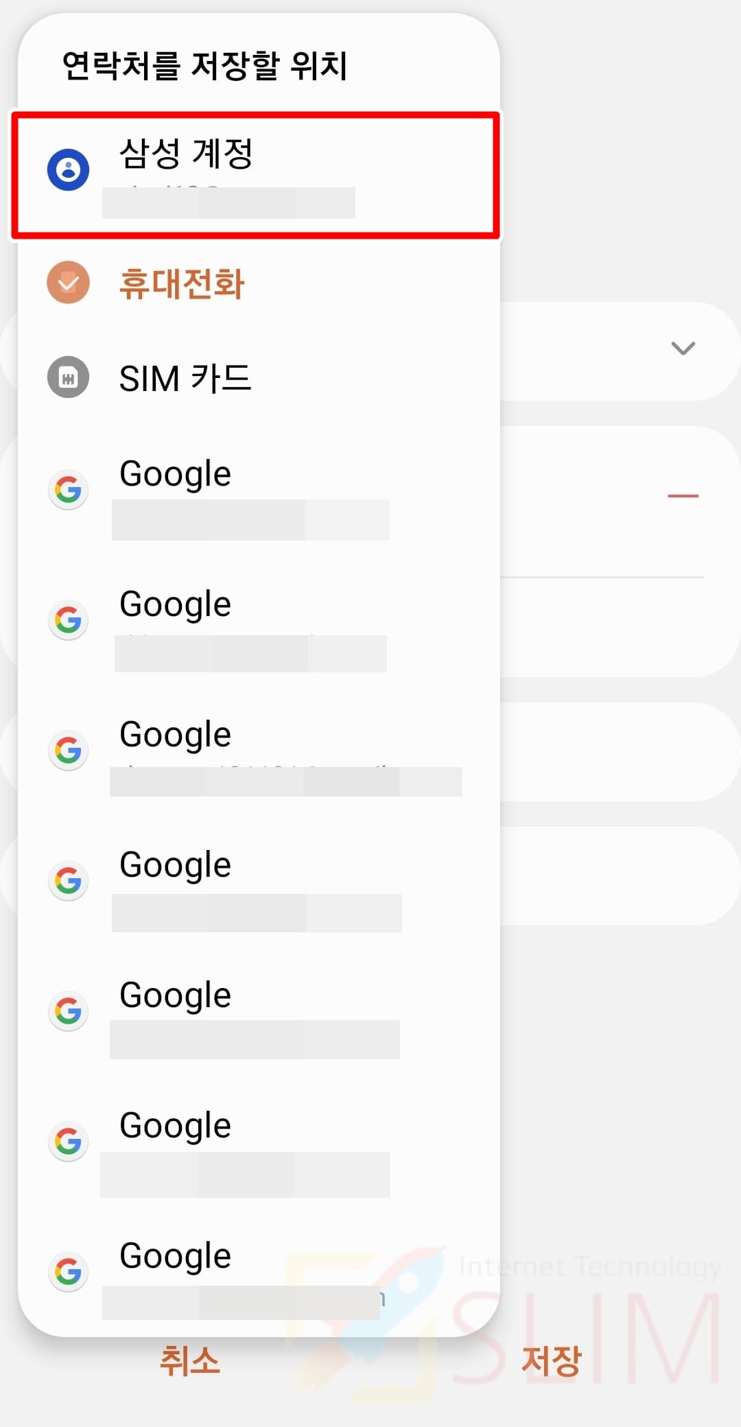 4. 현재 연락처가 저장된 저장위치를 선택합니다.