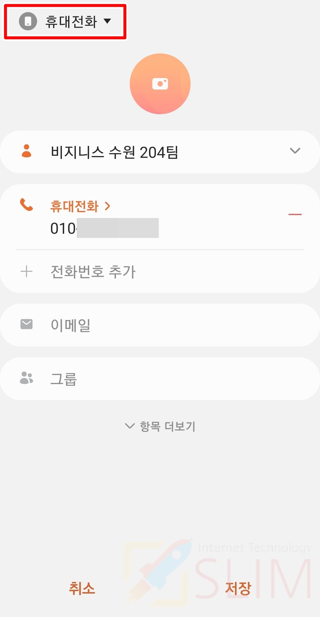 저는 휴대전화로 되어 있는데요. 이 의미는 새로운 연락처의 이름, 번호등을 입력하고 저장버튼을 누르면 저장위치가 휴대전화로 이동된다는 뜻입니다. 이제 연락처를 저장했을 때의 위치를 수정해주시면 되겠습니다.