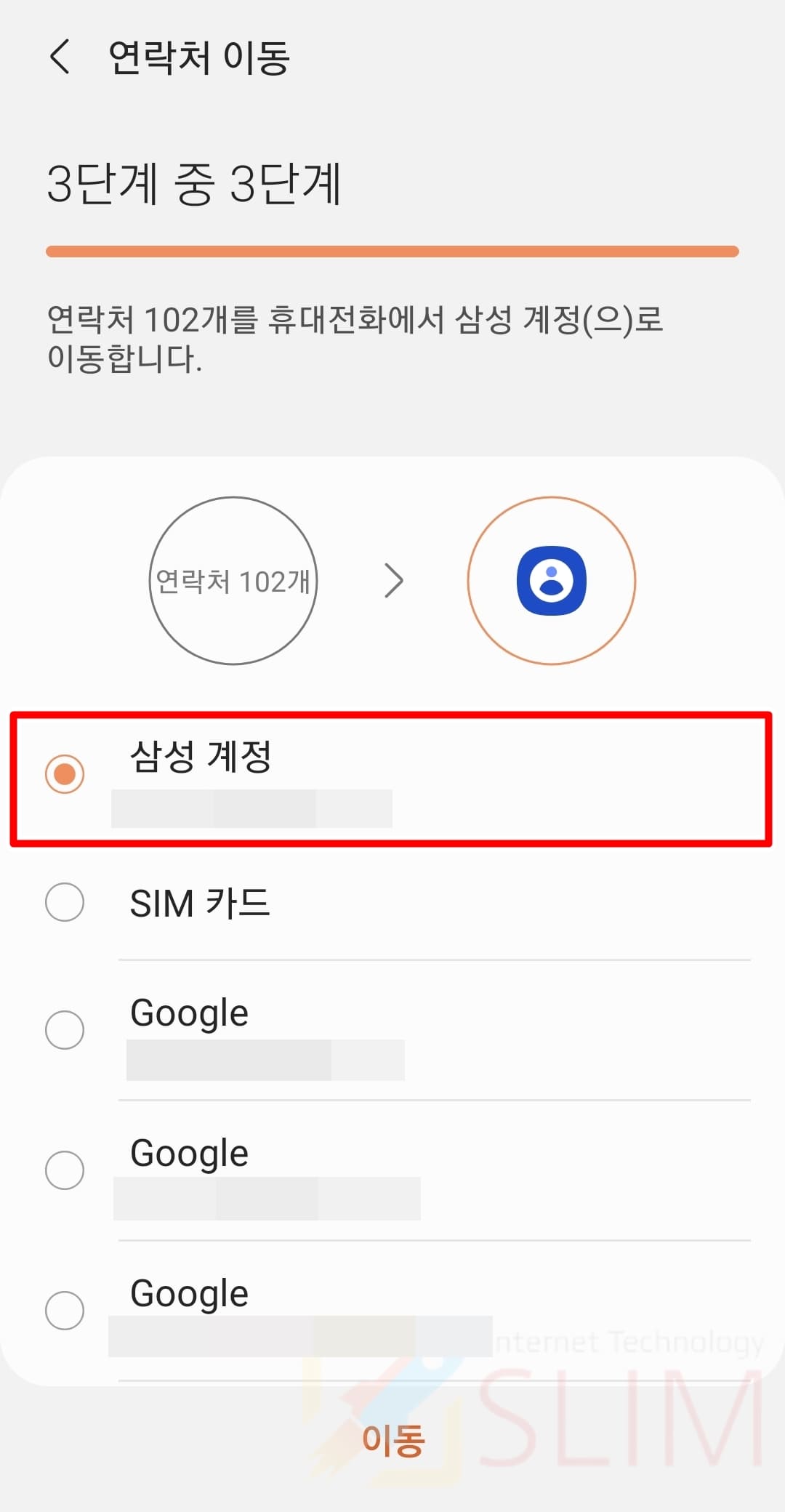 저는 삼성계정을 선택해주었습니다. 이렇게 삼성계정, 구글계정으로 연락처 저장위치를 변경시켜주면 향후에 휴대폰을 분실하더라도 쉽게 연락처 정보를 새 핸드폰에 백업시켜줄 수 있습니다.