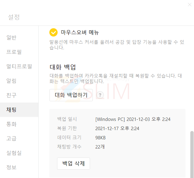 보시다시피 백업일시, 복원기한, 데이터크기, 채팅방개수가 보여지면서 백업이 성공적으로 된 것을 볼 수 있습니다. 참고로 대화 복원 기한은 14일까지로 기한이 지나면 자동 삭제되어 복원이 불가능해집니다. 백업 데이터는 텍스트만 가능하기 때문에 사진, 동영상, 파일은 모바일 복원이 안된다는 점 참고하시길 바랍니다.