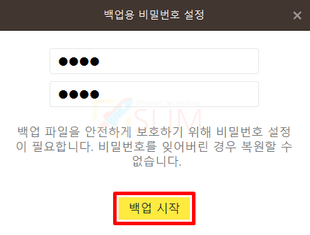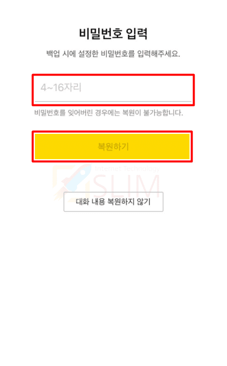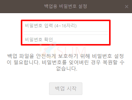 현재 설정하고 있는 비밀번호는 모바일 카톡 앱에서 복원시킬 때 입력을 해야하기 때문에 꼭 기억해두시길 바랍니다. 비밀번호는 4~16자리로 설정이 가능합니다.
