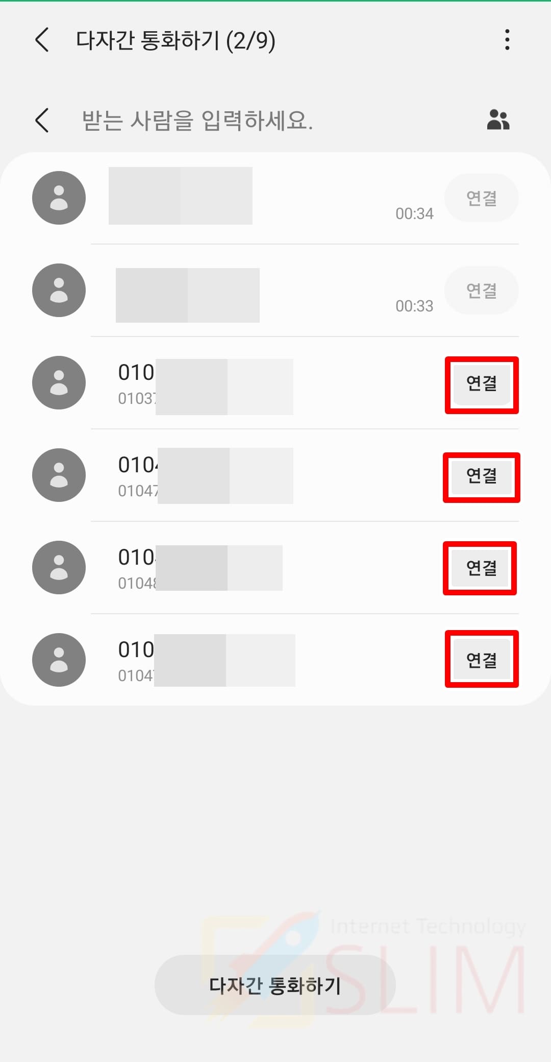 연결은 추가된 사람별로 하나씩 모두 눌러주셔야 합니다. 카톡 그룹콜처럼 동시에 초대해서 전화를 하면 편리하겠지만 갤럭시 다자간 통화에서는 한명씩 일일히 추가 및 연결을 해주게 됩니다.