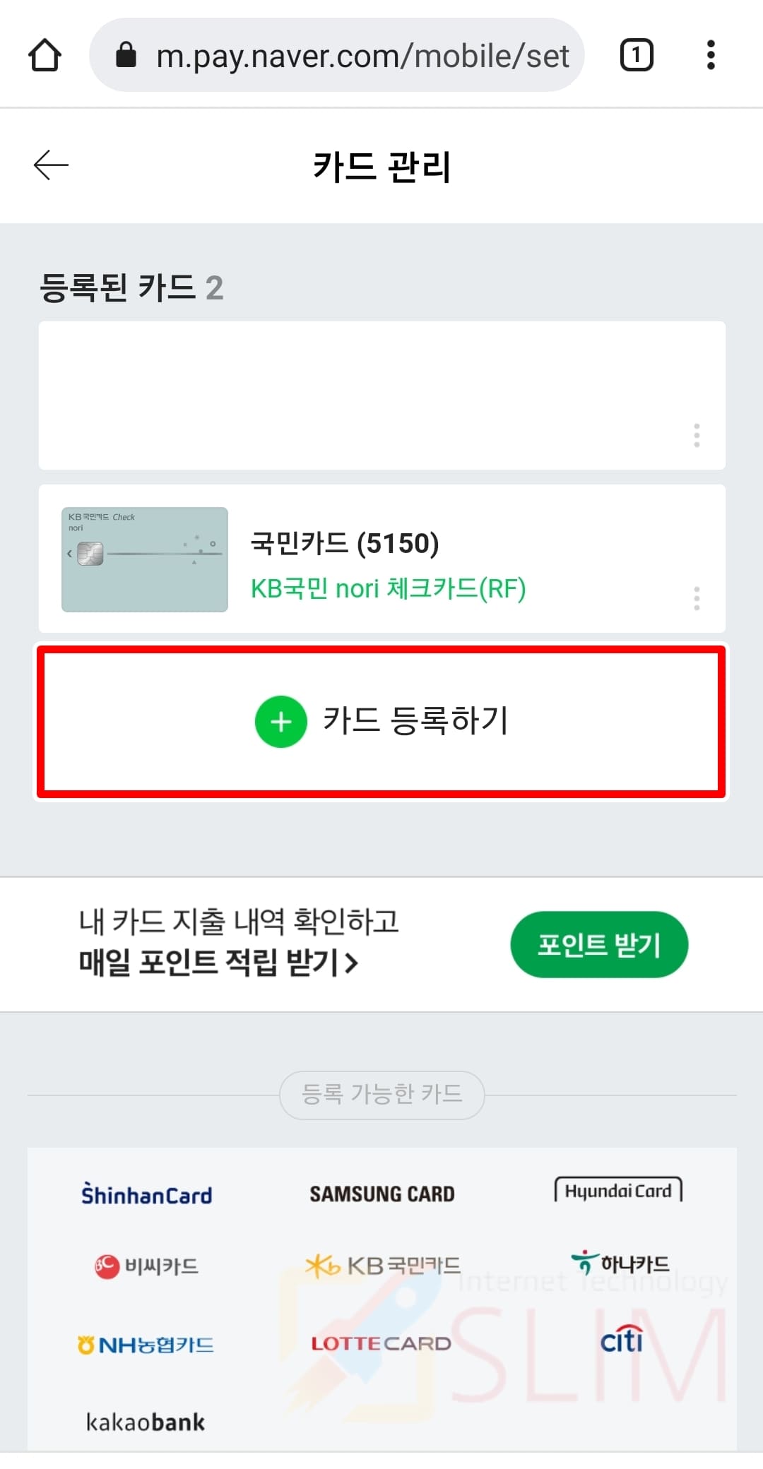 4. 우측 상단에서 +카드등록 버튼을 클릭합니다.