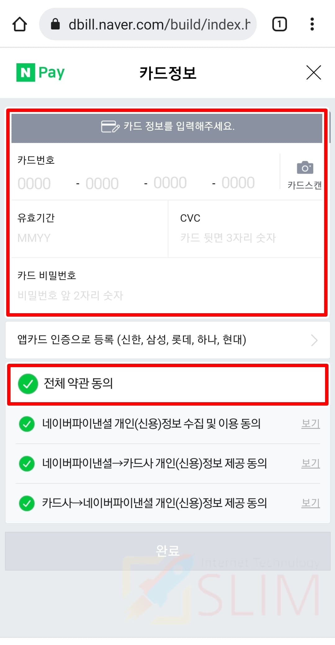 7. 전체 약관 동의 후 저장하면 카드등록이 완료됩니다.