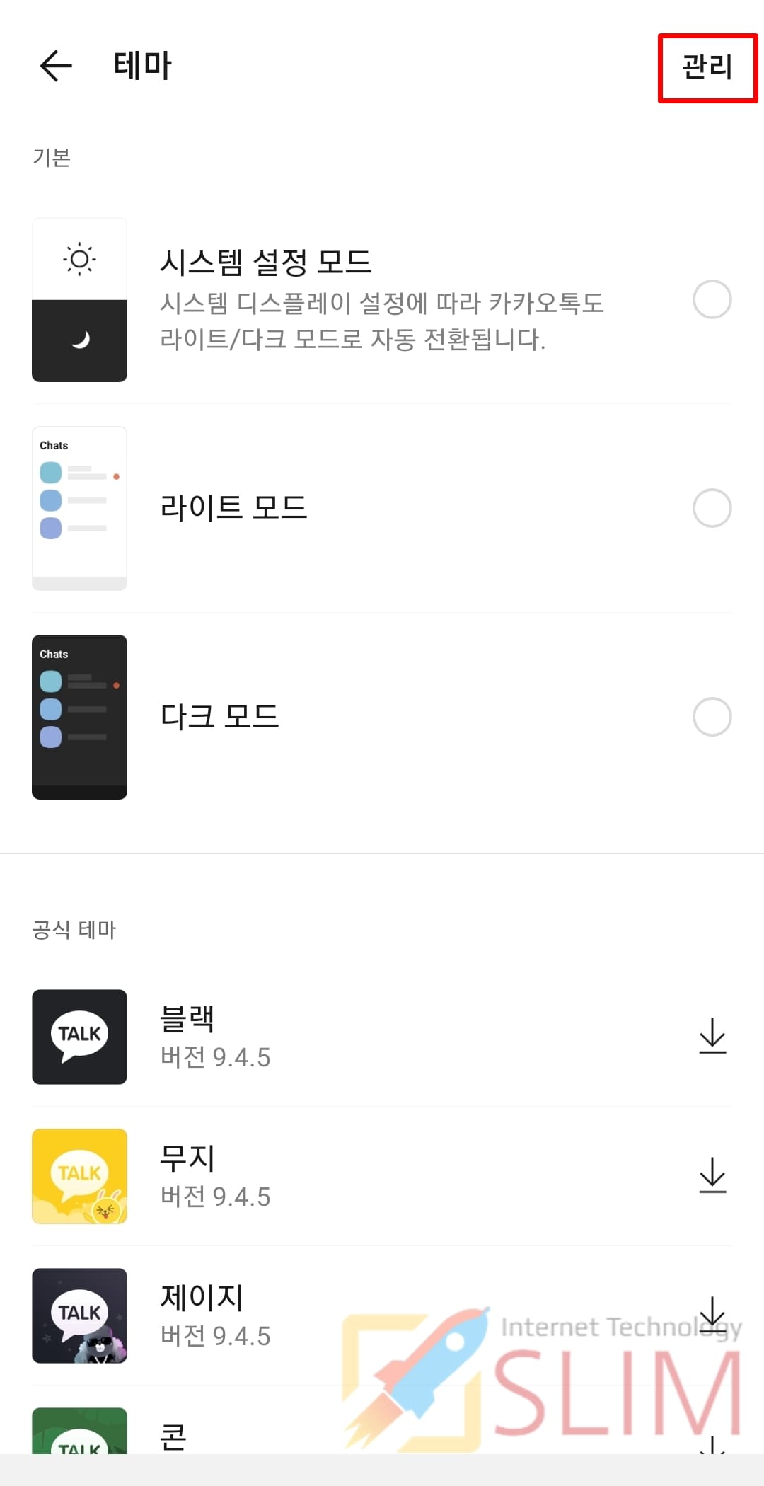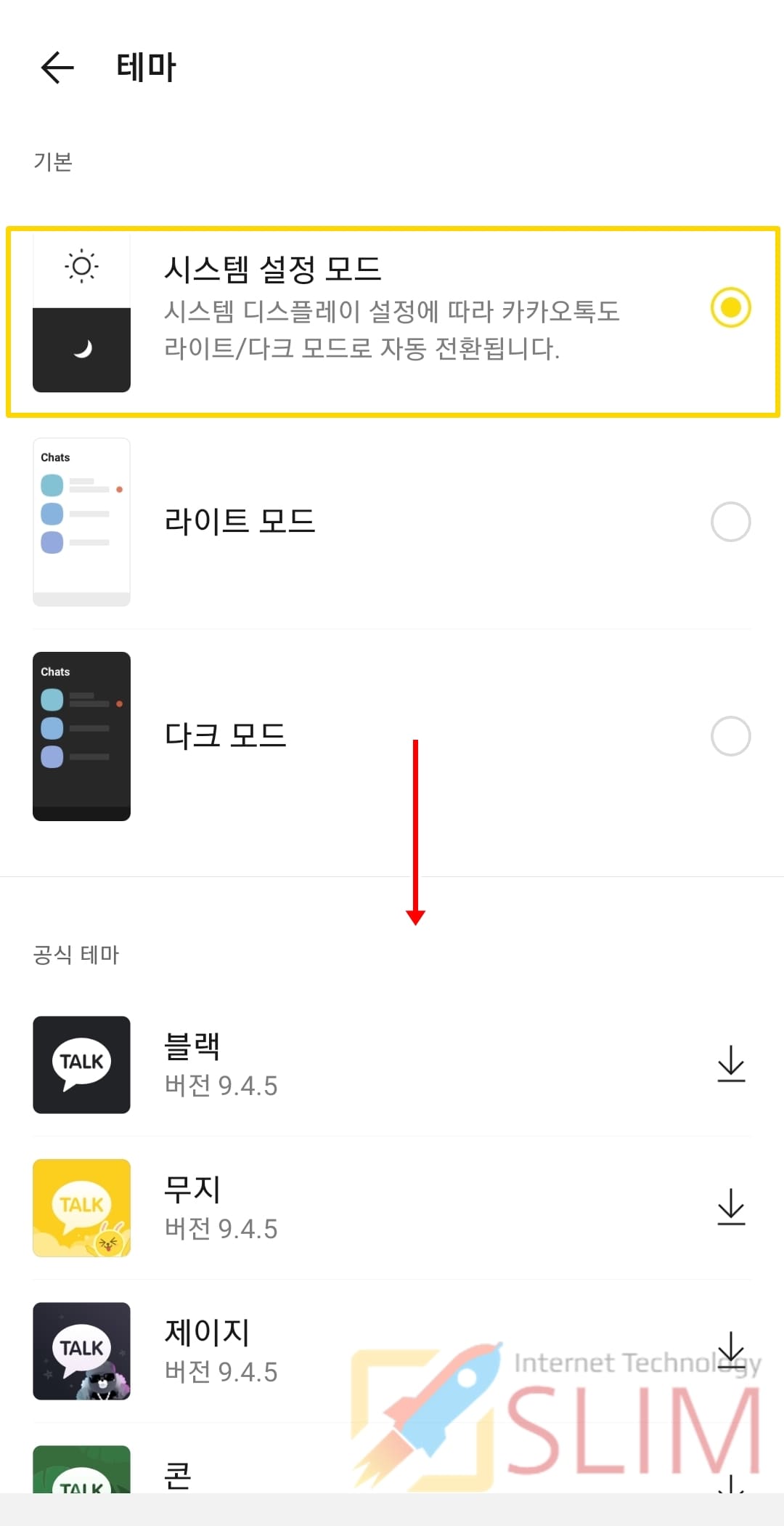 ※ 카카오톡 기본 테마로 시스템 설정 모드가 체크되어 있습니다. 이것은 스마트폰 시스템 디스플레이 설정에 따라서 카카오톡에 라이트/다크 모드로 자동 전환되는 기능인데 이 중 라이트 모드는 가벼운 용량으로 더 빠른 속도의 카카오톡을 이용할 수 있는 테마를 의미합니다.