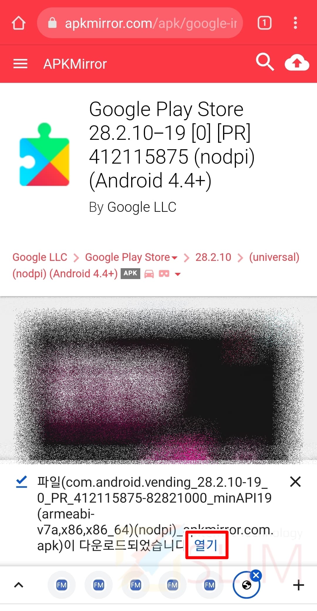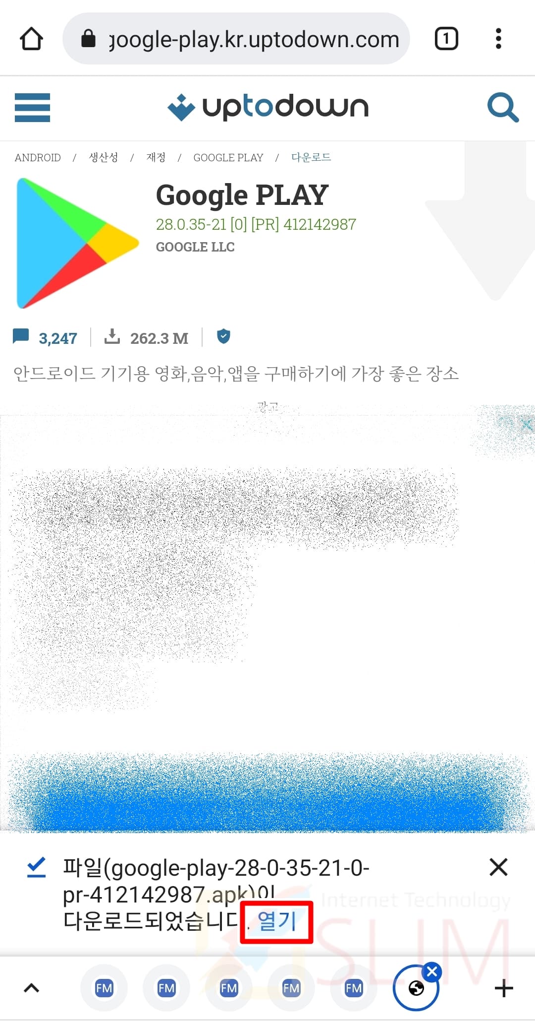 7. 다운된 구글 플레이 스토어 apk 안내에서 열기를 누릅니다.