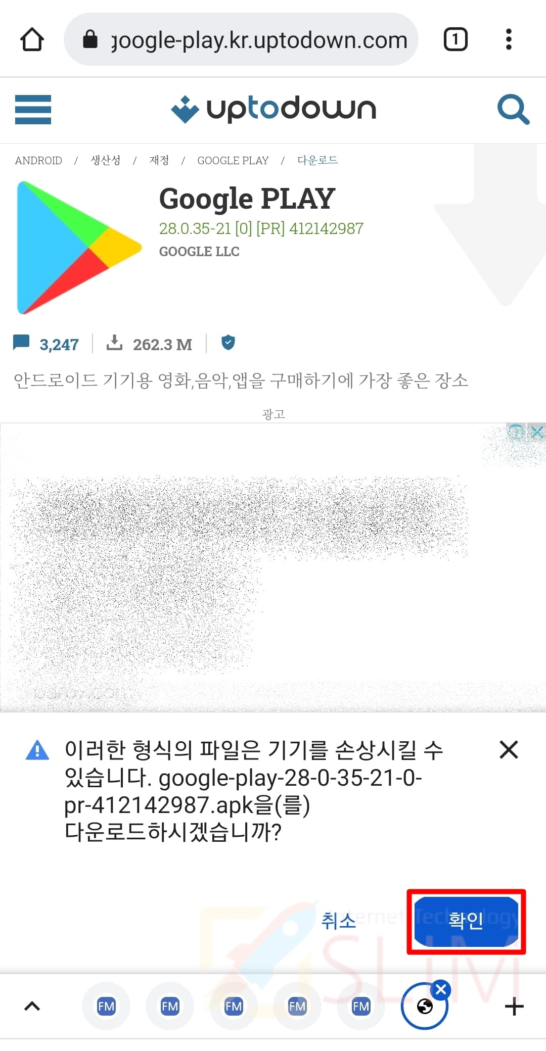 이러한 형식의 파일은 apk를 의미하는 것인데 스마트폰에서는 신뢰할 수 없는 인터넷 사이트에서 apk 파일을 다운로드 받는다고 생각하다보니 위와 같이 기기를 손상시킬 수 있다는 경고 알림을 보여주게 됩니다. 하지만 현재 사용중인 업투다운 사이트를 안드로이드 기반 휴대폰에서 유명한 앱 다운 사이트이니 걱정하지 마시고 진행해주시면 됩니다.