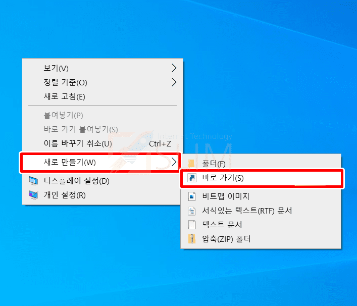 2. 새로 만들기(W) > 바로 가기(S)를 클릭합니다.
