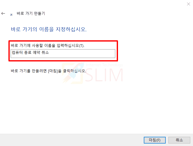 바로가기에 사용할 이름으로 저는 '컴퓨터 종료 예약 취소'라고 작성해주었습니다. 마침을 눌러주시면 종료 예약 취소 바로가기 아이콘이 바탕화면에 만들어집니다. 이후에 아이콘 속성에서 디자인을 변경해주시면 되겠습니다.