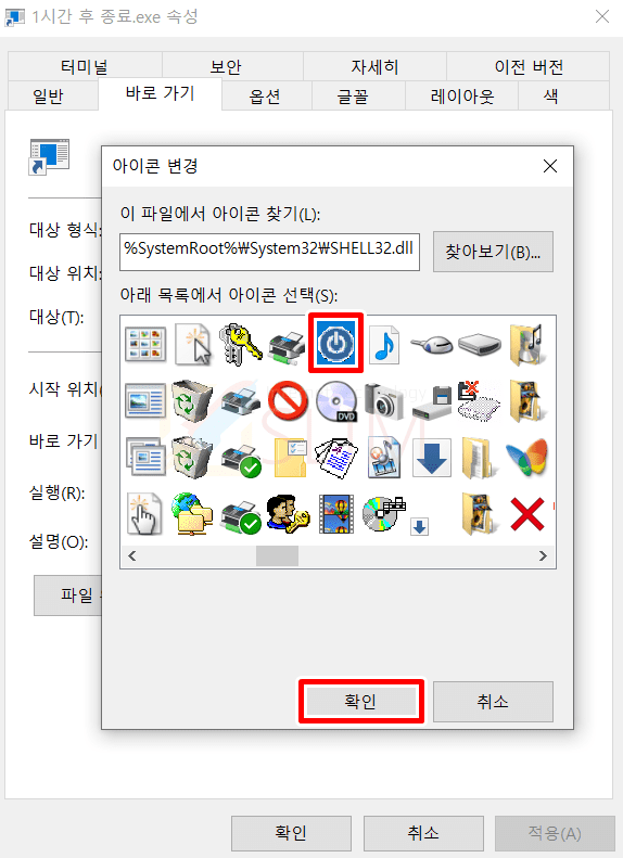 이렇게 만들어두면 굳이 실행을 켜고 명령어를 입력하지 않아도 쉽게 컴퓨터를 예약 종료시킬 수 있습니다. 바로가기 아이콘의 디자인이 마음에 들지 않기 때문에 아래에서 아이콘 그림을 바꿔주도록 하겠습니다.