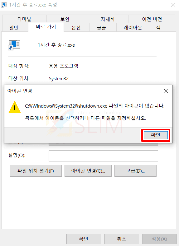 12. 아이콘 변경 안내 창에서 확인을 클릭합니다.