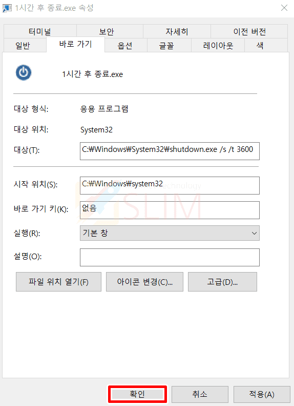 명령어 끝의 숫자는 종료시간 초단위라는 설명을 드렸었습니다. 현재 만들고 있는 간편 바로가기 아이콘은 1시간 후 윈도우10 예약 종료를 설정하는 것으로 원하는 시간이 있으시다면 뒷 숫자를 변경하시거나 여러개를 만드시면 됩니다. (ex. 1800(30분), 3600(1시간), 5400(1시간 30분) 등)