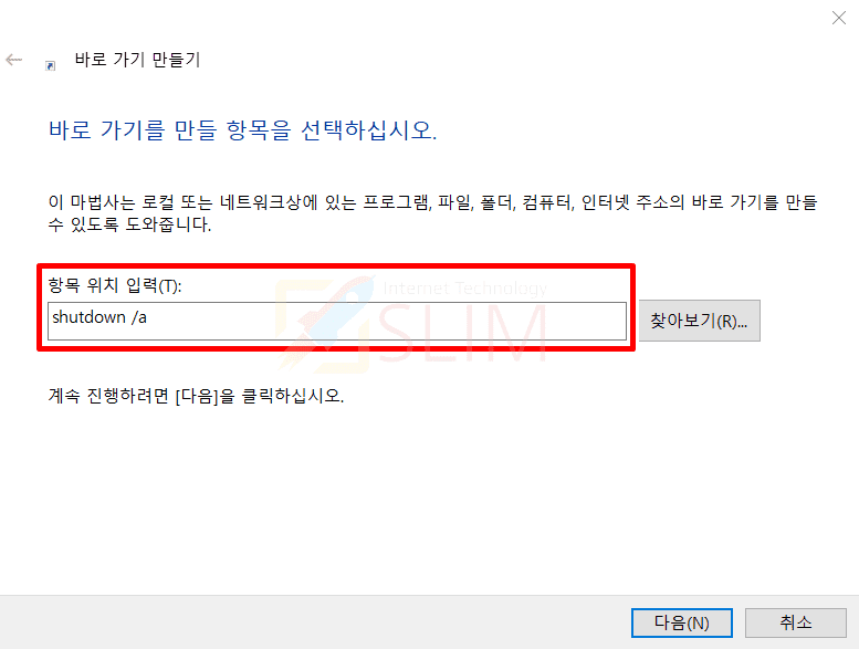 바탕화면에서 [마우스 우클릭 > 새로만들기 > 바로가기]를 누릅니다. 그 후에 항목 위치 입력(T)에 shutodown /a를 입력하시고 진행하시면 됩니다.