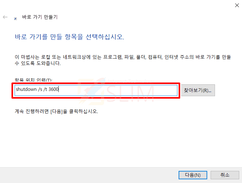 3. 항목 위치 입력(T) 아래에 shutdown /s /t 3600을 입력합니다.