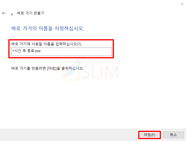 저는 바로가기 이름에 '1시간 후 종료.exe'로 붙여주었는데요. 이름은 구분하기 쉽도록 예약 종료될 시간을 넣어주는 것이 좋습니다. 뒤에 있는 exe는 붙이지 않으셔도 되니 편하게 작성해주시면 됩니다.