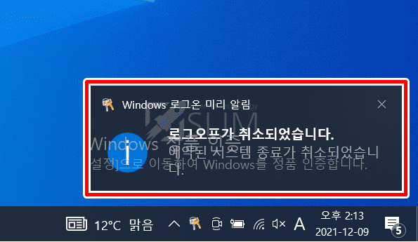 화면 우측에서 Windows 로그온 미리 알림 '로그오프가 취소되었습니다. 예약된 시스템 종료가 취소되었습니다' 메시지를 확인할 수 있습니다.