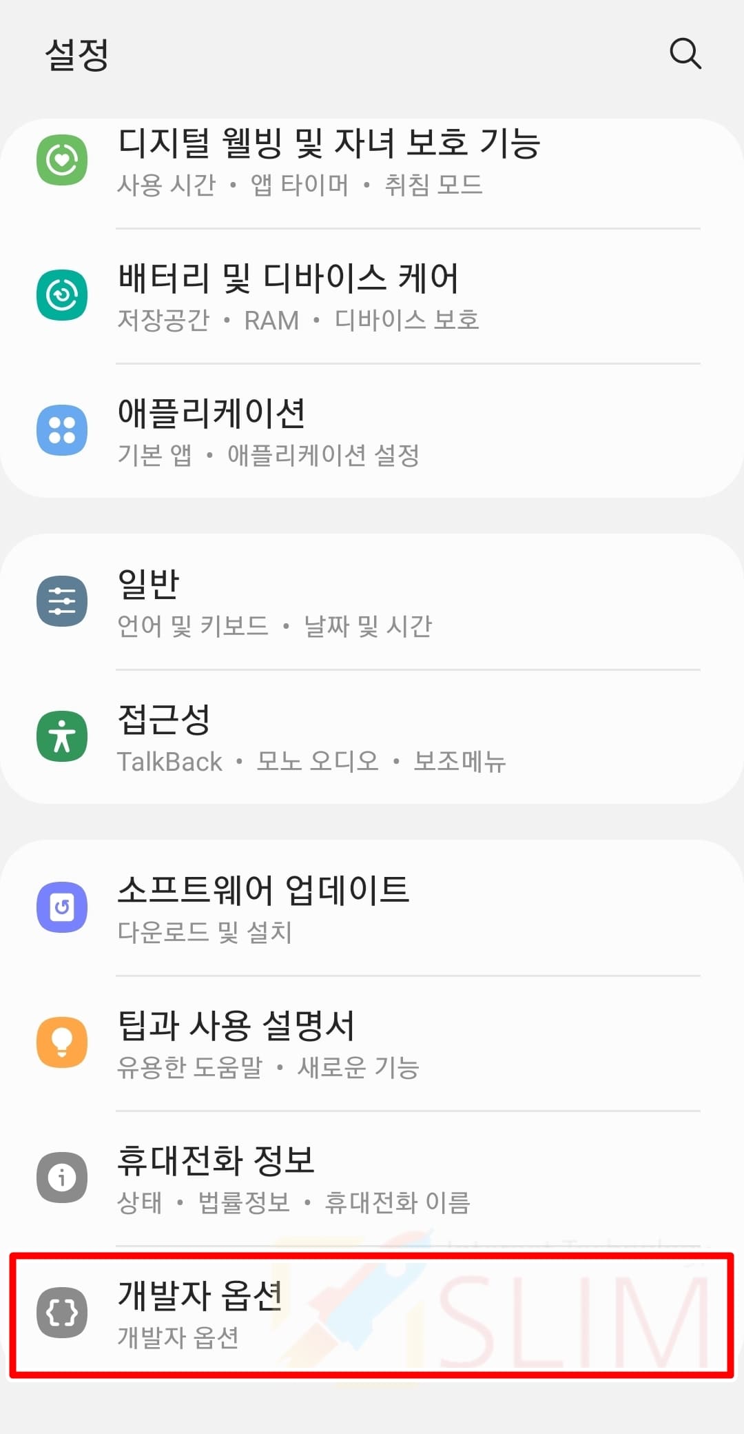 6. 설정 앱 홈 화면 아래에 생겨난 개발자 옵션을 클릭합니다.