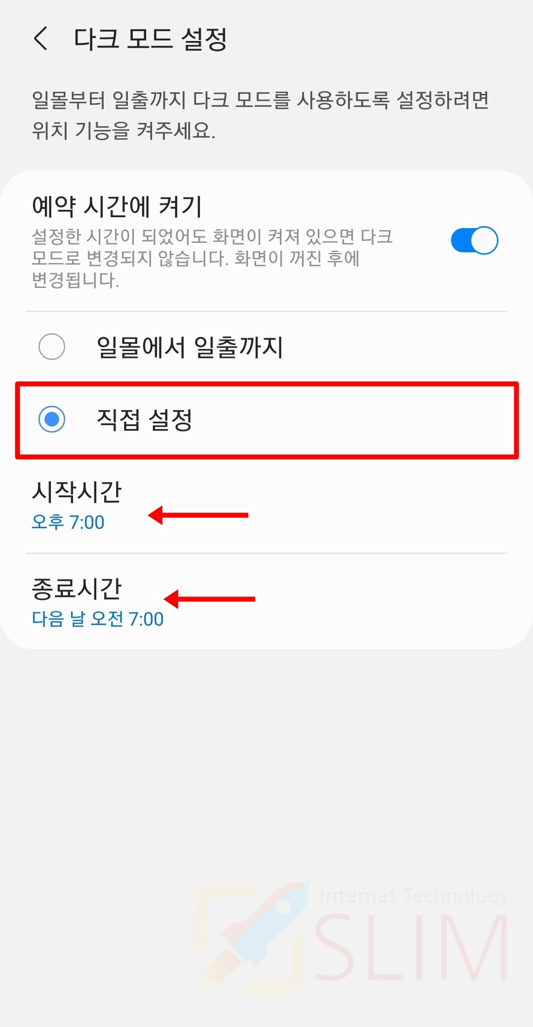 기본적으로 시작시간은 오후 7:00분이고 종료시간은 다음 날 오전 07:00분입니다. 본인의 사용패턴에 맞춰서 시간을 자율적으로 조정해주시면 됩니다. 참고로 갤럭시 다크모드 예약시간 자동켜기는 설정한 시간이 되었어도 화면이 켜져 있다면 (사용중) 다크모드로 변경되지 않습니다. 화면이 꺼진 후에 변경되니 설정 시간이 되셨다면 갤럭시 전원버튼을 눌러 껏다가 다시 켜시면 자동 적용이 될 것입니다.