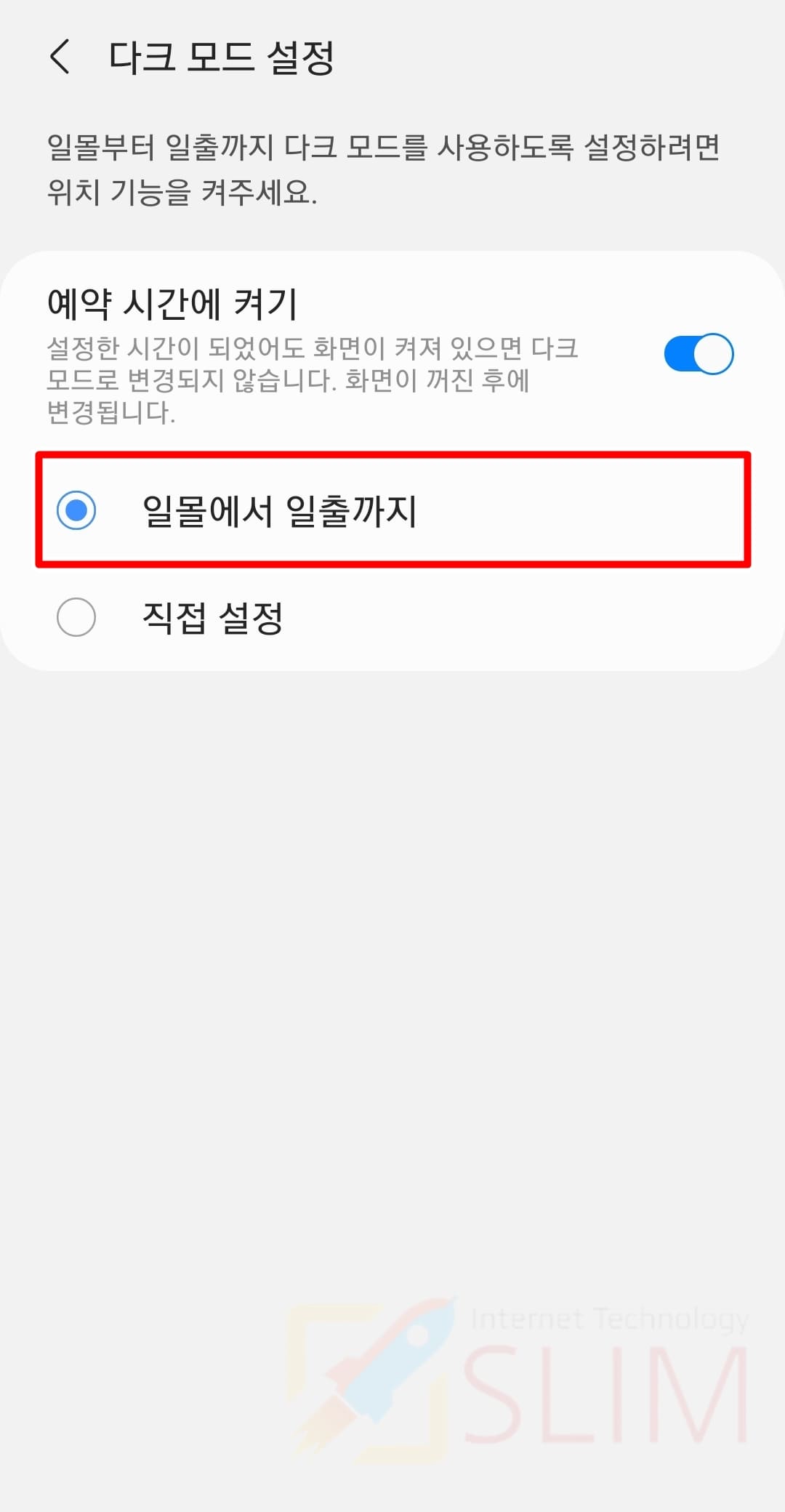 일몰에서 일출까지는 현재 지역 기준으로 해가 지는 저녁에 다크모드가 켜지고, 해가 뜨는 아침에 다크모드가 해제되면서 일반 라이트모드로 바뀌는 것을 의미합니다. 이 기능을 사용하기 위해선 GPS 기능을 켜야합니다.