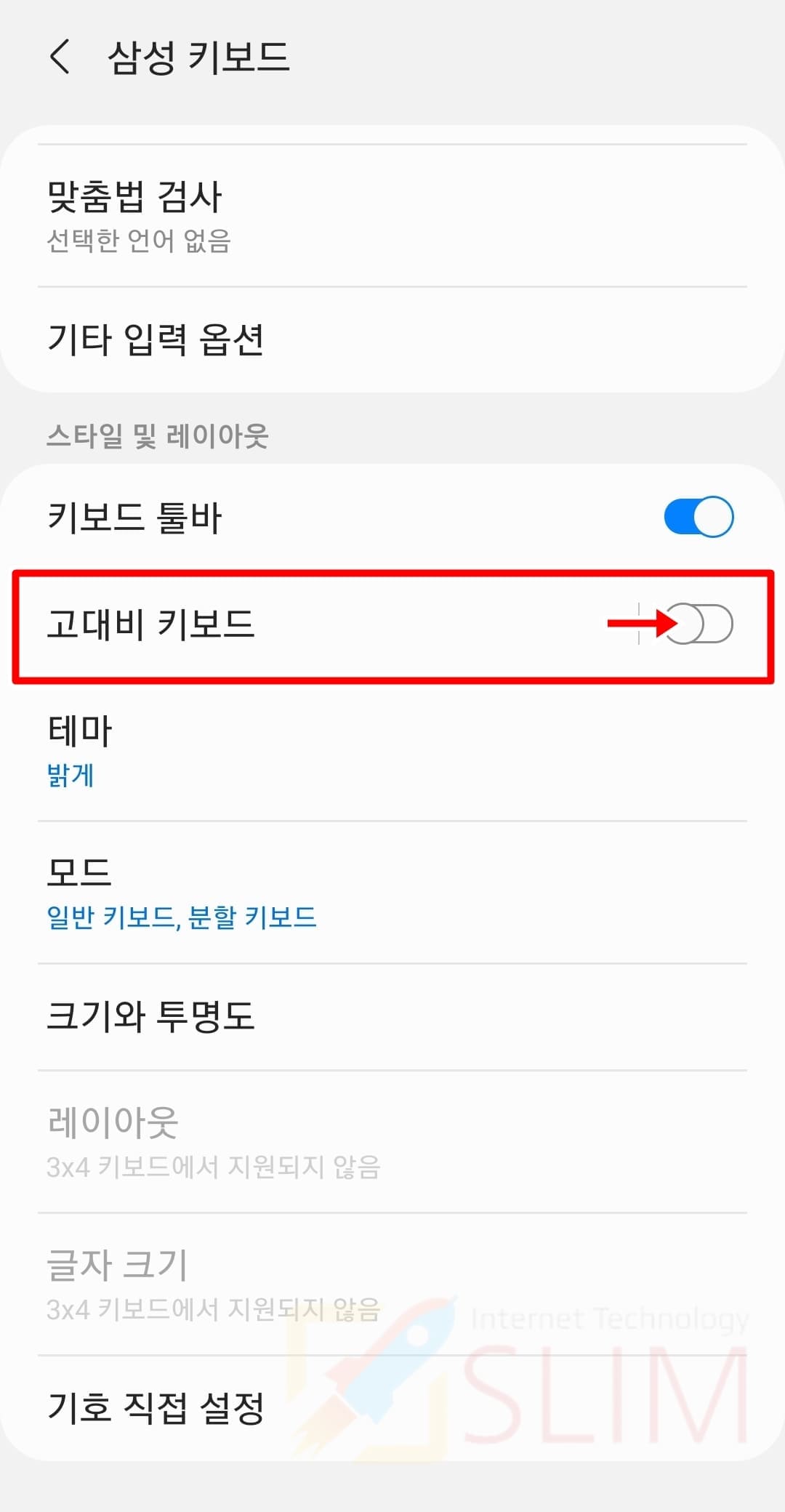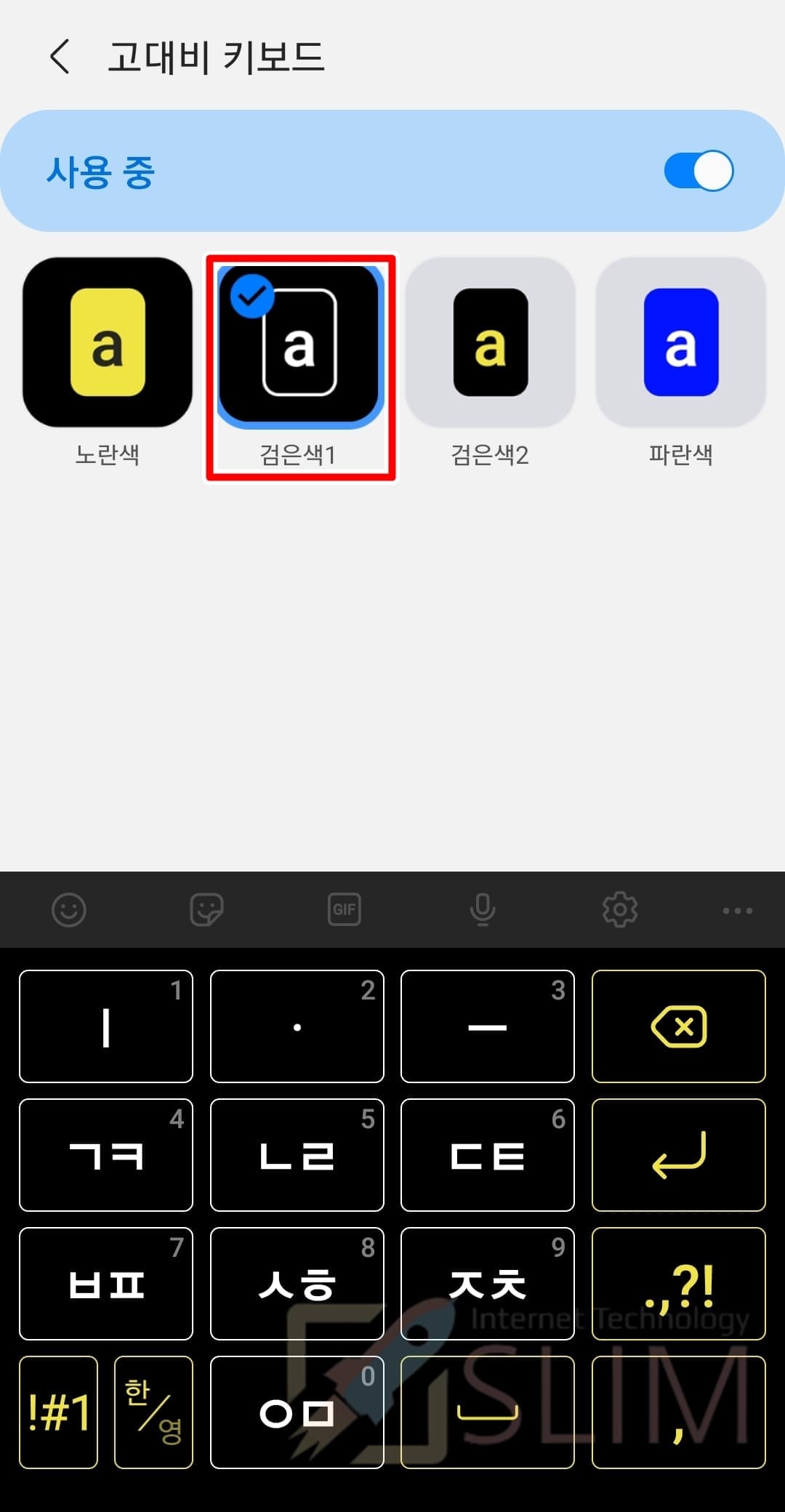 갤럭시 키보드 크기 조절시 함께 알고 있으면 유용한 고대비 키보드 테마를 함께 소개드리도록 하겠습니다. 타이핑시 글자가 잘보이지 않거나, 입력이 어려울 때에는 글자 버튼을 강조할 수 있는 고대비 키보드를 설정하는 것을 추천드립니다.