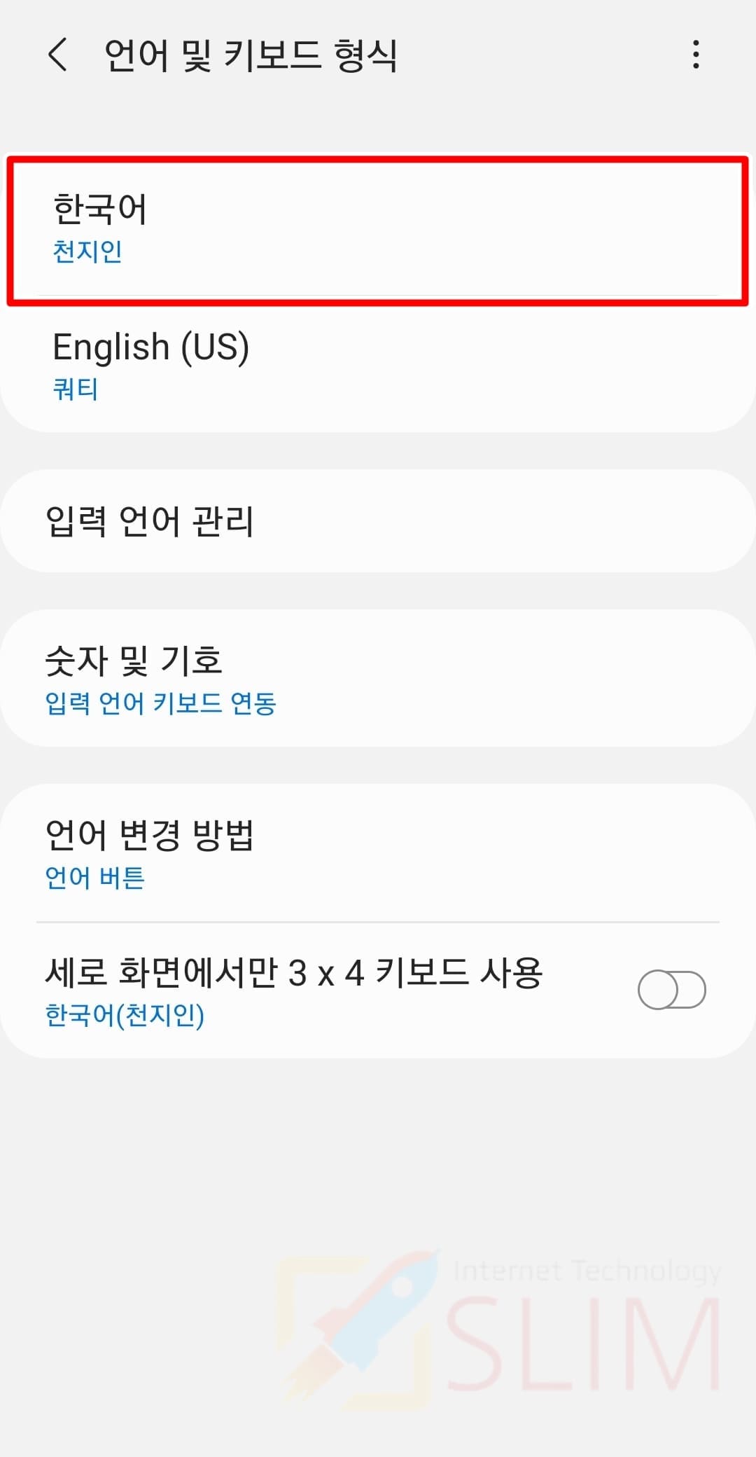 갤럭시에서는 기본 키보드 형식이 한국어는 천지인, 영어(English)는 쿼티 모양입니다. 그래서 키보드 모양을 변경하면 키보드 자판 글자 버튼 크기를 변경시킬 수 있습니다.